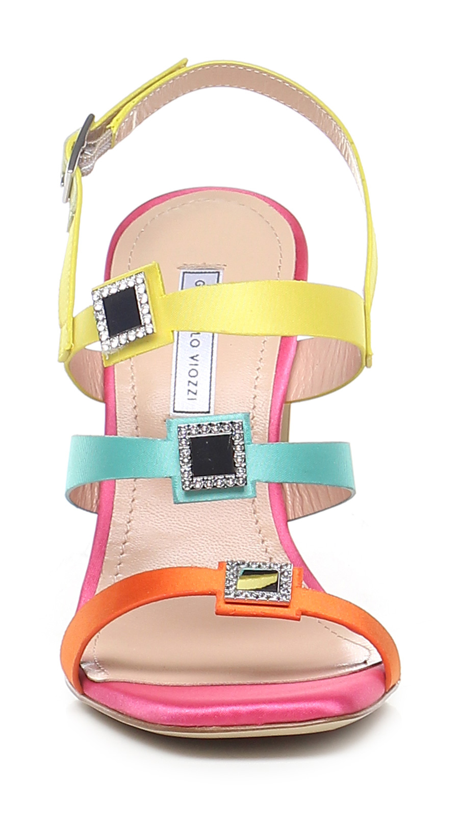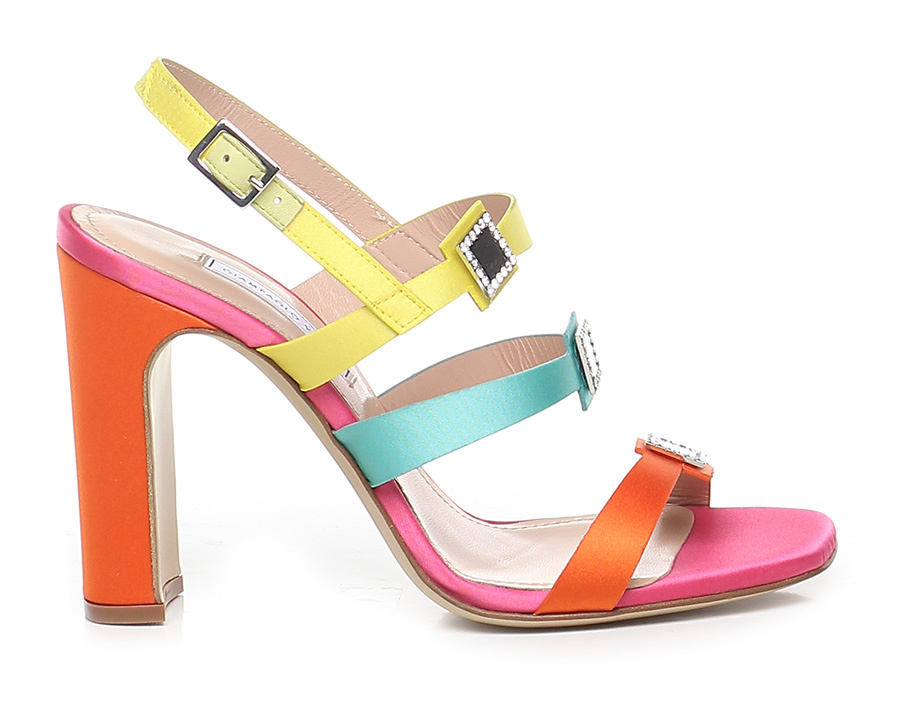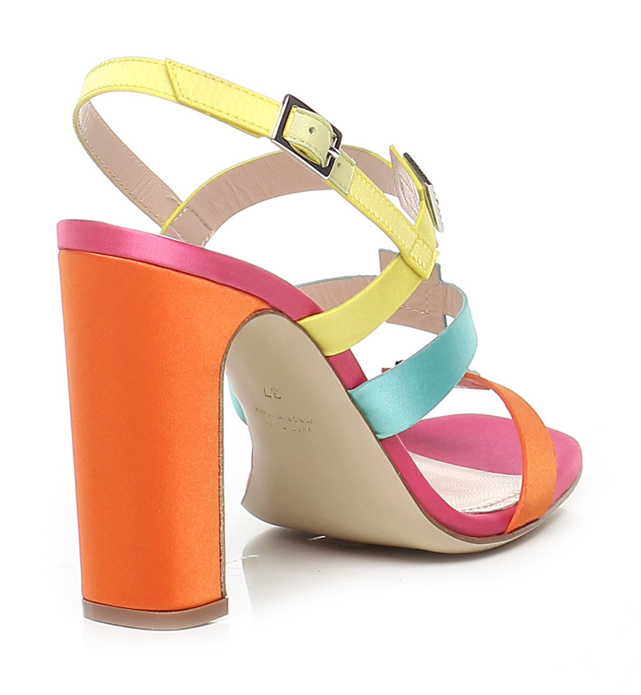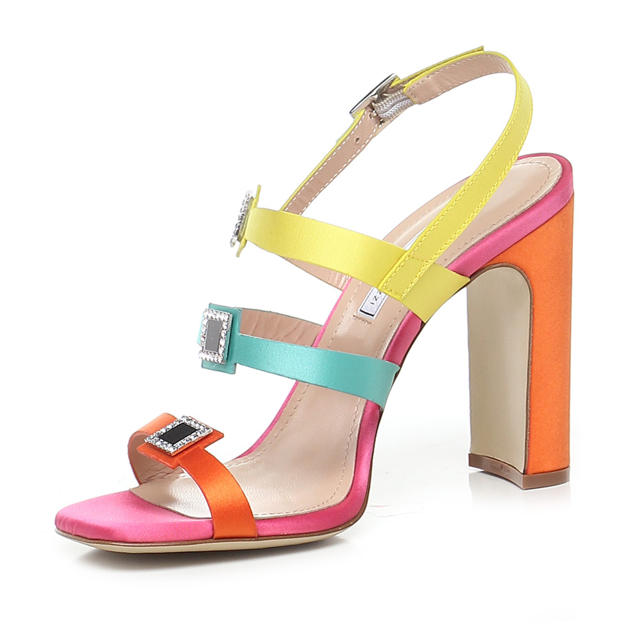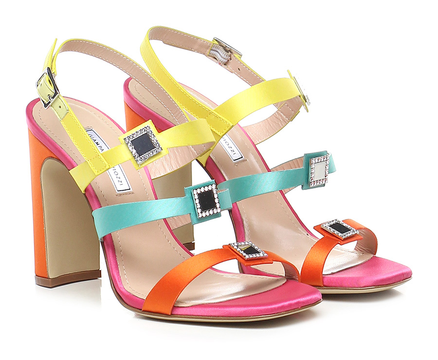 Sandalo alto in tessuto raso con cinturino sul retro e accessori effetto metallo con strass , suola in cuoio. Tacco 100.