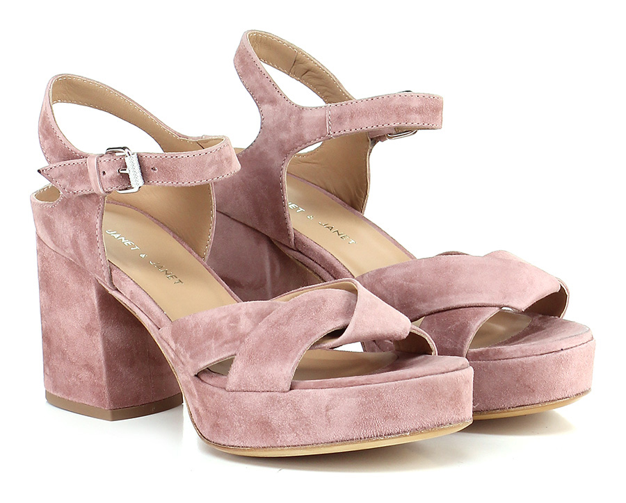 Sandalo alto in camoscio con cinturino alla caviglia con suola in cuoio. Tacco 90, platform 30 con battuta 60.