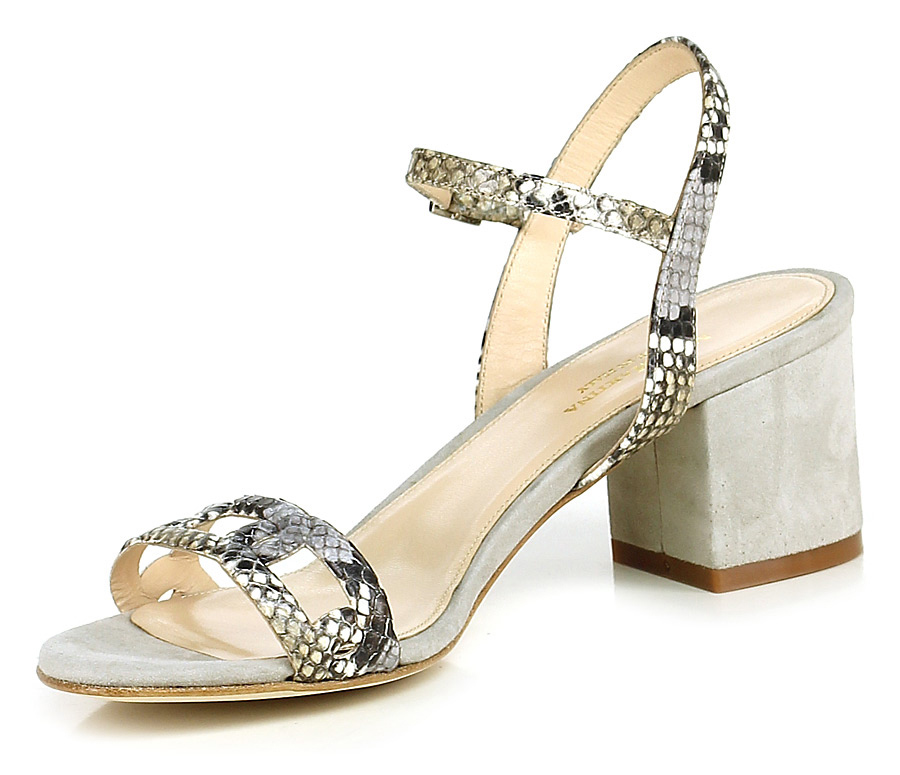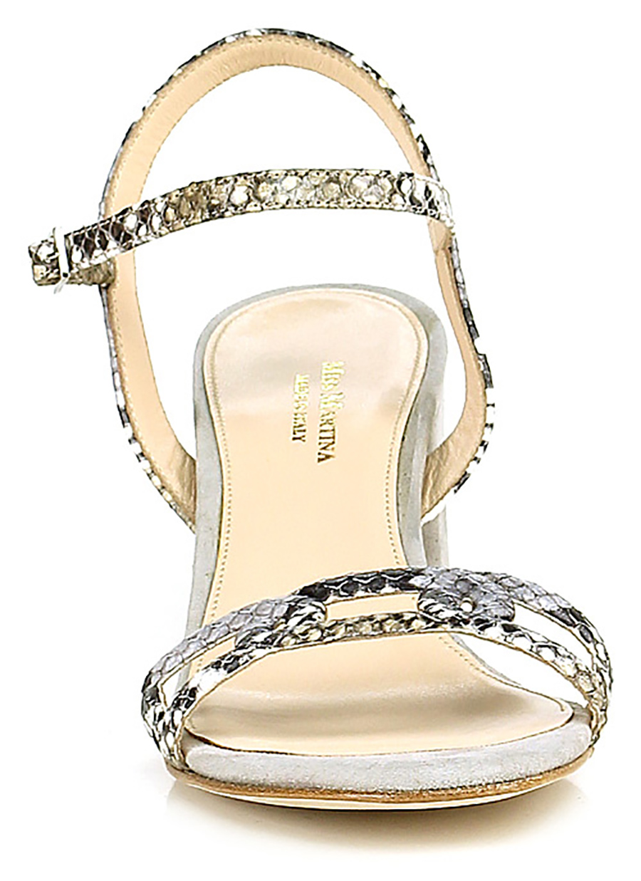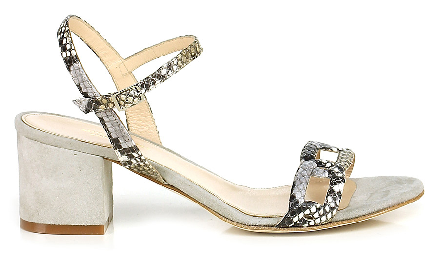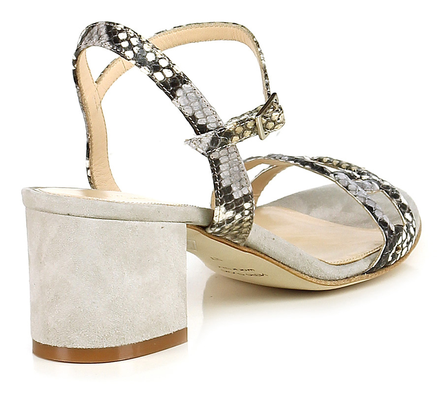 Sandalo alto in pelle stampa pitone con cinturino alla caviglia e suola in cuoio. Tacco 65.