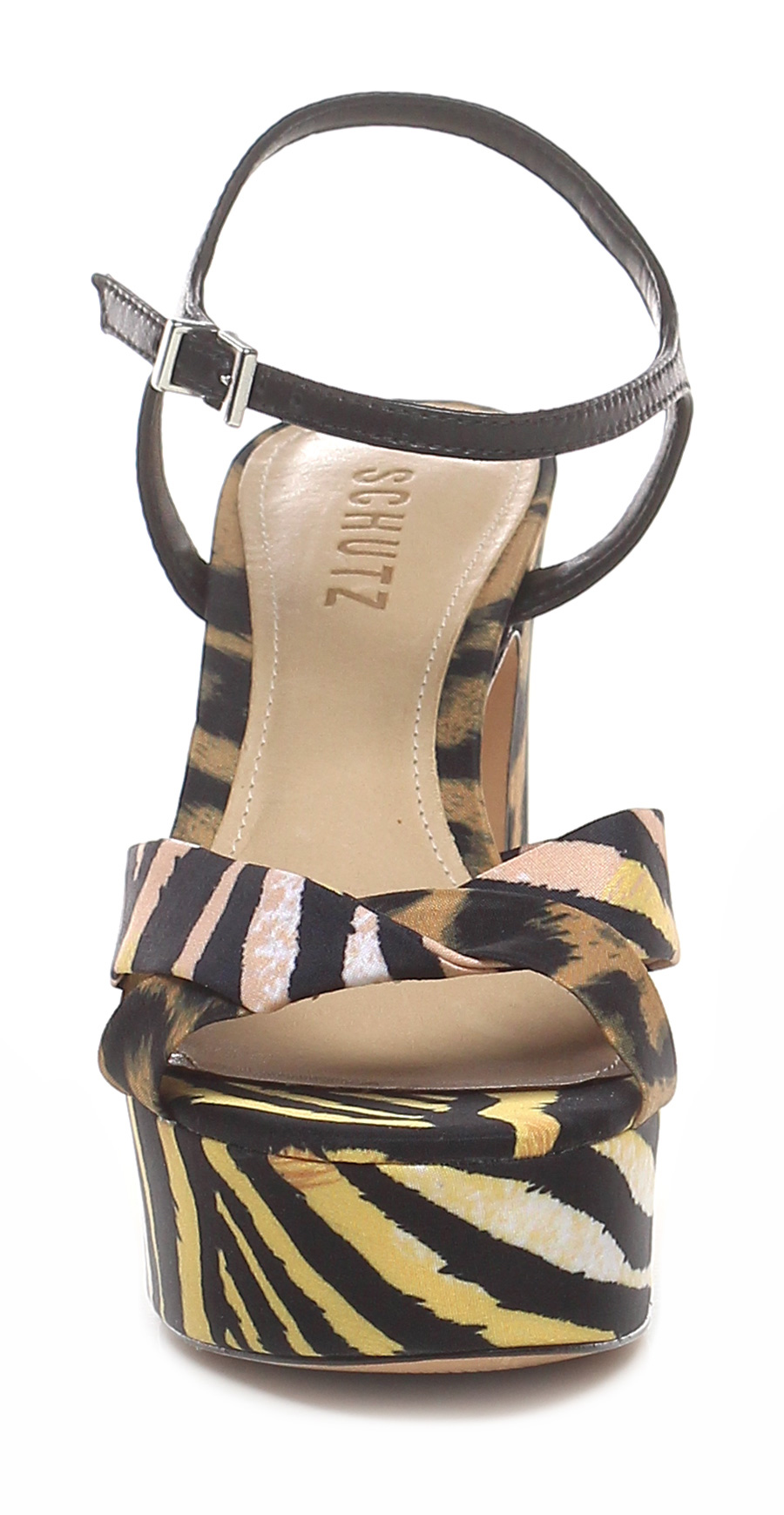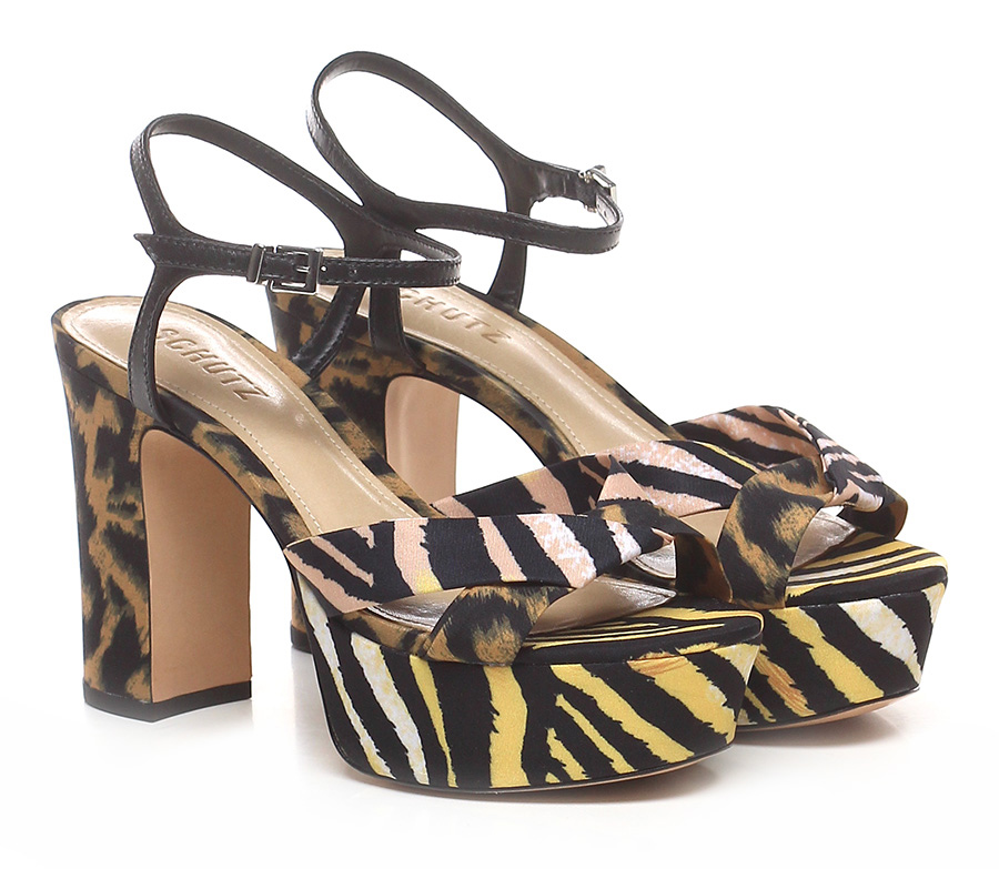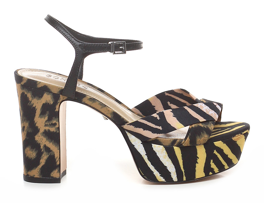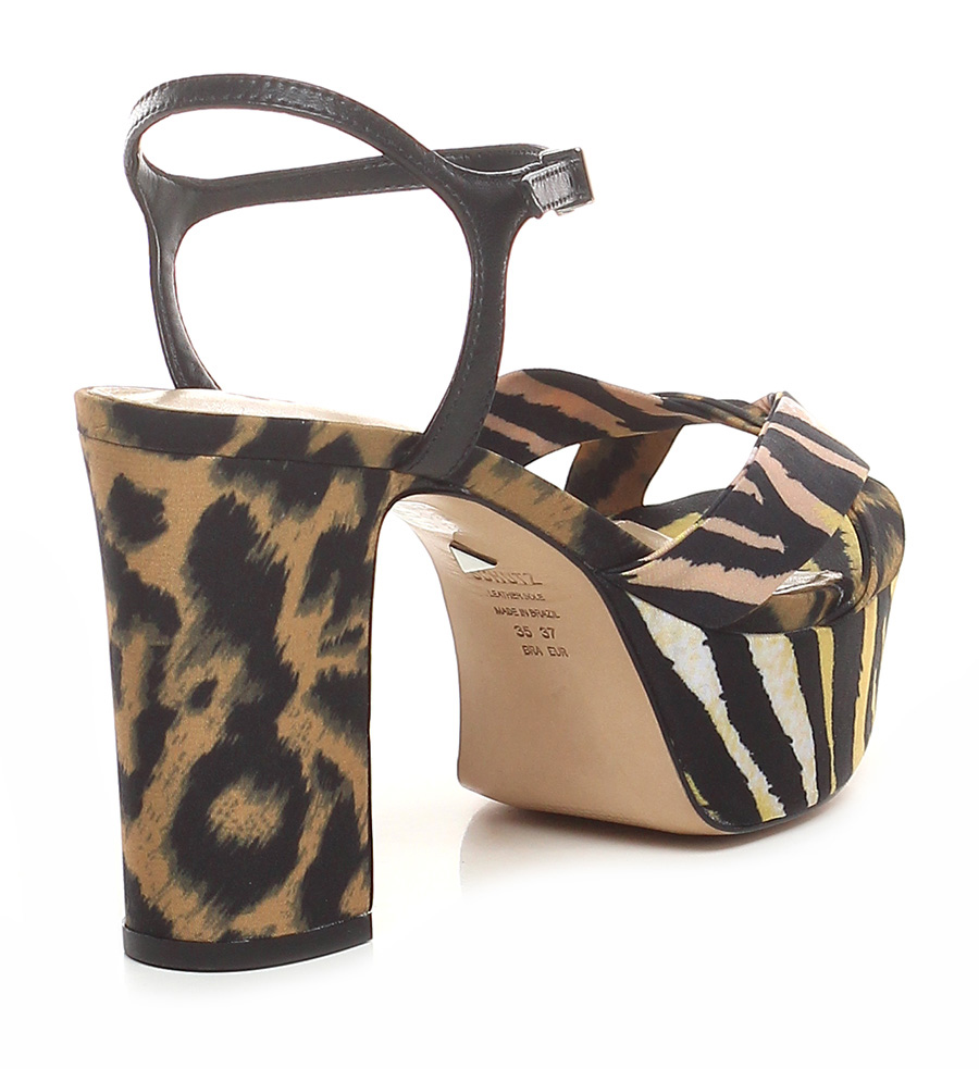 Sandalo alto in tessuto e pelle con cinturino alla caviglia e suola in cuoio. Tacco 105, platform 45 con battuta 60.