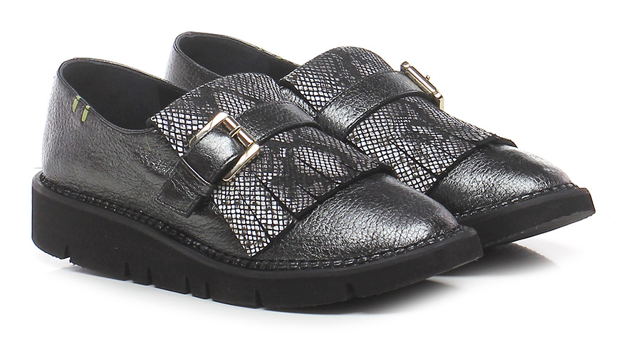 Scarpa bassa in pelle, cinturino con fibbia frontale e patella con frange in pelle stampa pittone, suola in gomma light. Tacco 30, platform 20 con battuta 10.