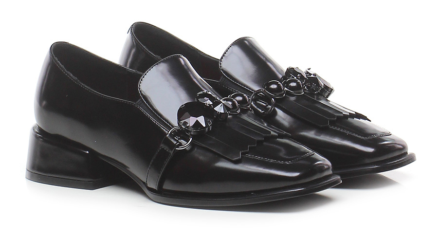 Scarpa bassa in eco pelle spazzolata con accessorio su cinturino frontale, suola in gomma. Tacco 35, rivestito in pelle.