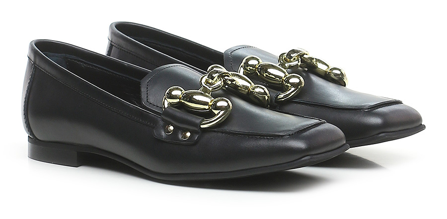 Scarpa in pelle con accessorio frontale. Suola in gomma. Altezza tacco 15mm.