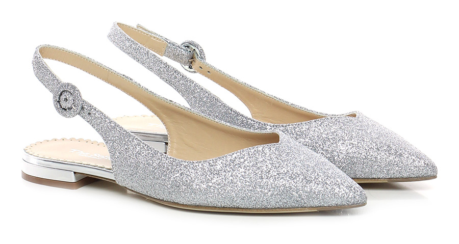 Scarpa bassa in glitter con cinturino su retro, suola in cuoio e gomma. Tacco 20