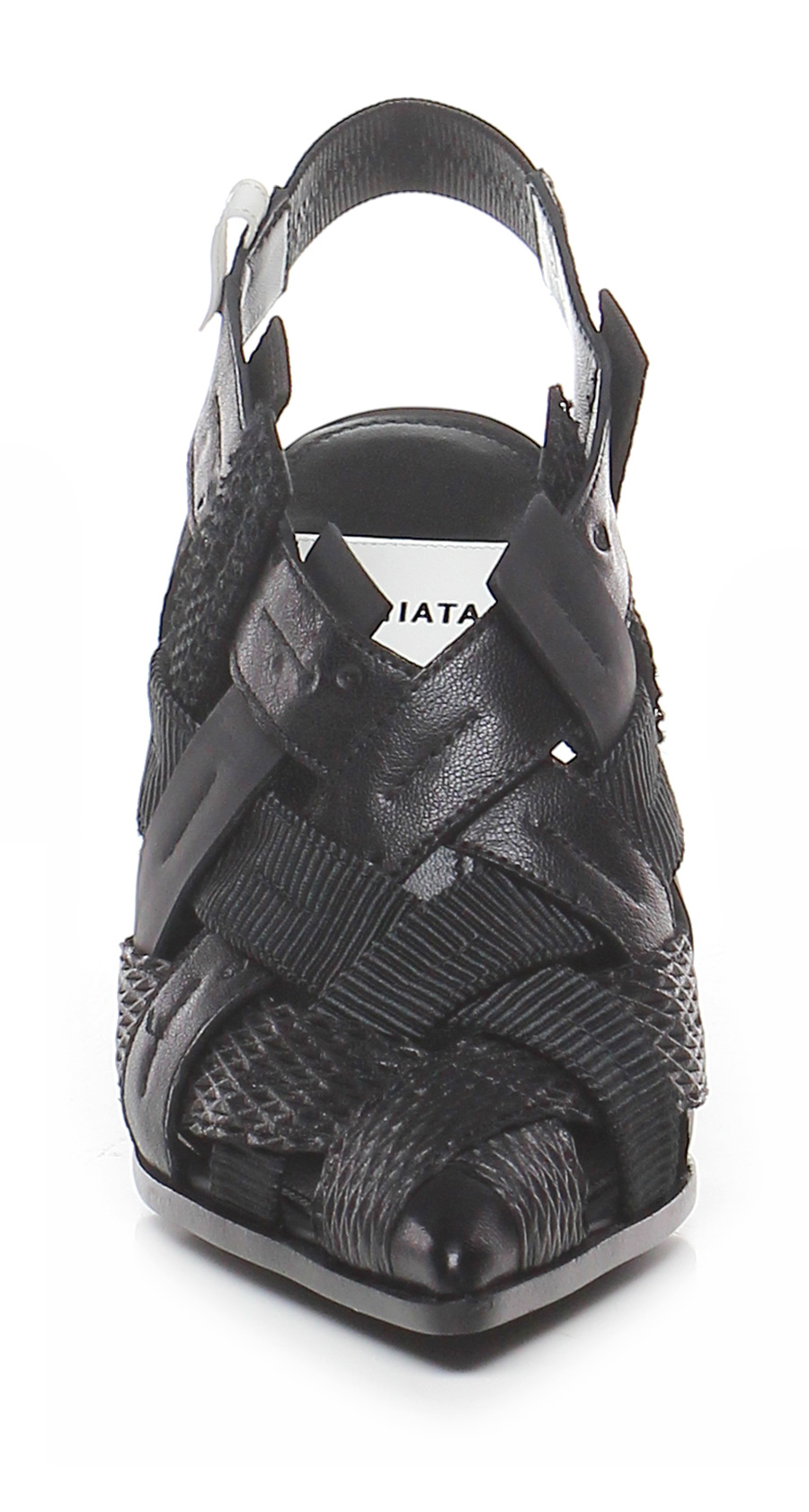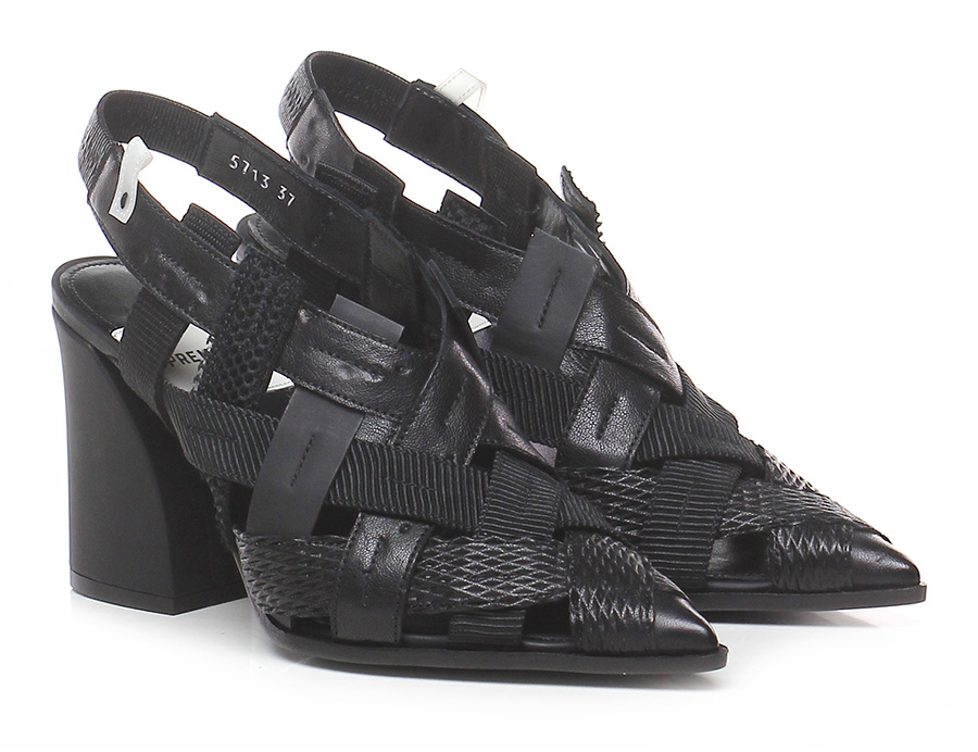 Scarpa con tacco in pelle e tessuto con cinturino elasticizzato sul retro, suola in cuoio e gomma. Tacco 95.