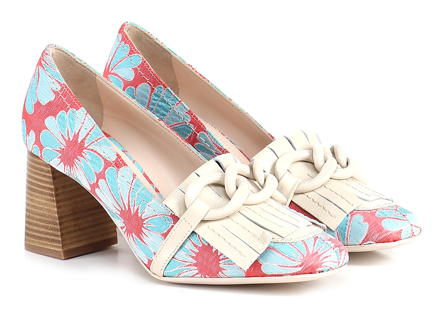 Scarpa con tacco in pelle e tessuto con pattella frontale con frange ed inserto a catena frontale. Suola in gomma, tacco 75.