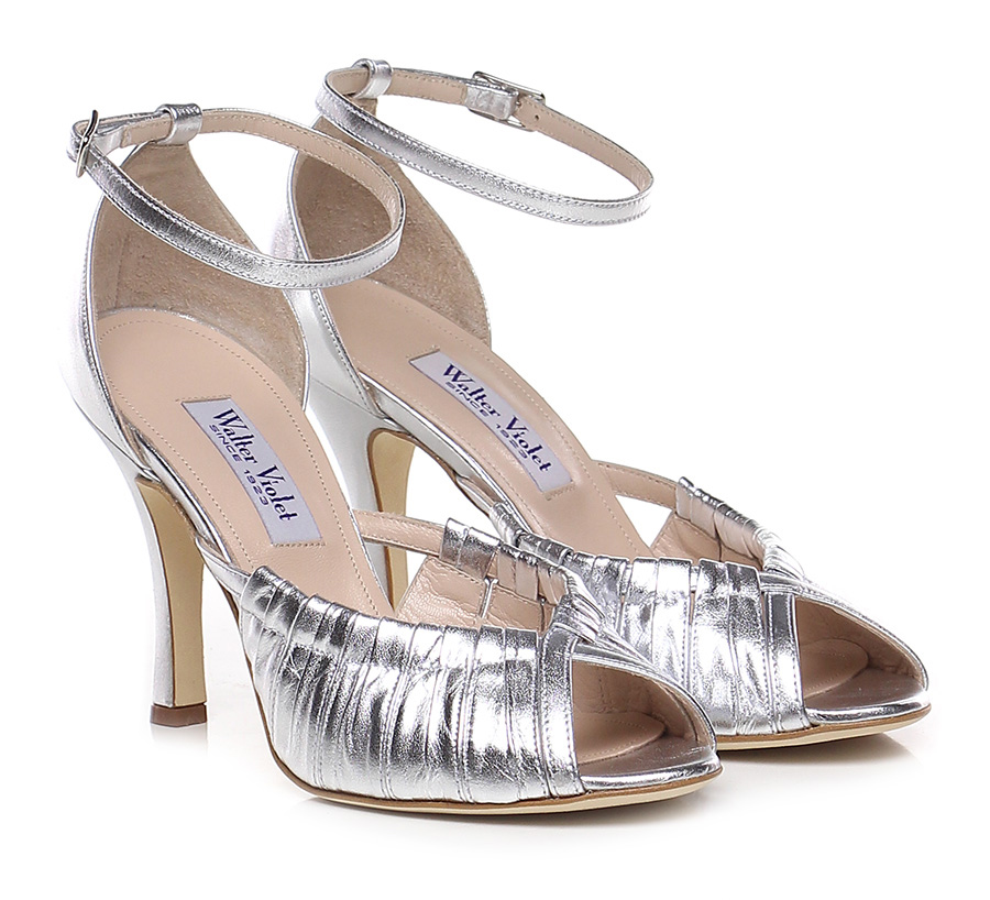 Scarpa con tacco in pelle laminata con cinturino alla caviglia, suola in cuoio. Tacco 90.