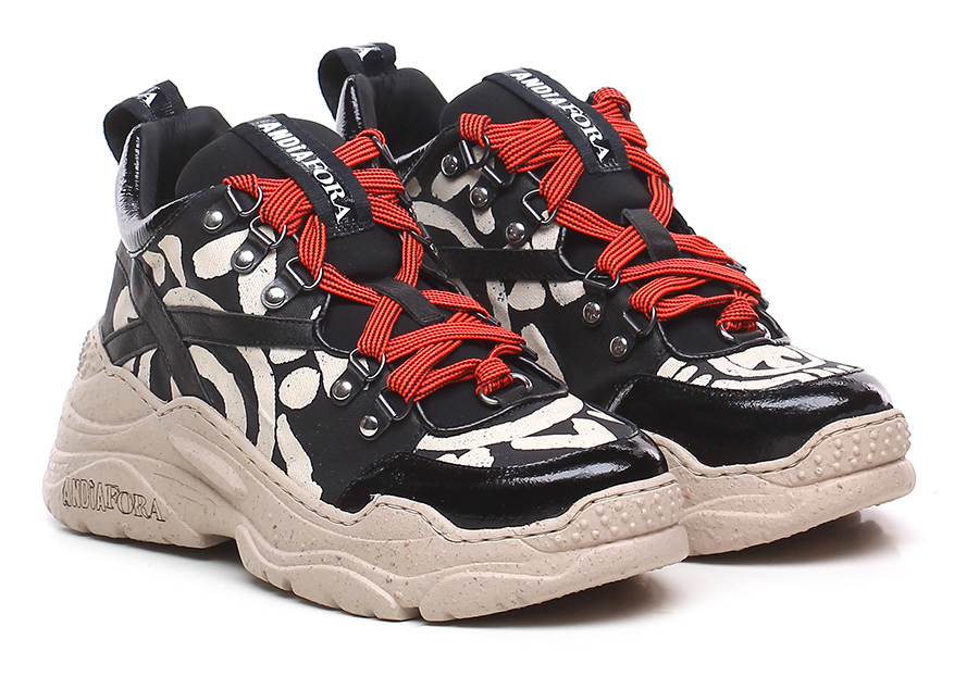 Sneaker in pelle vintage e pelle lucida con suola in gomma. Tacco 70, platform 30 con battuta 40.