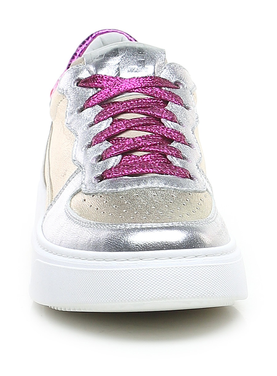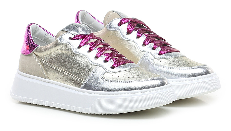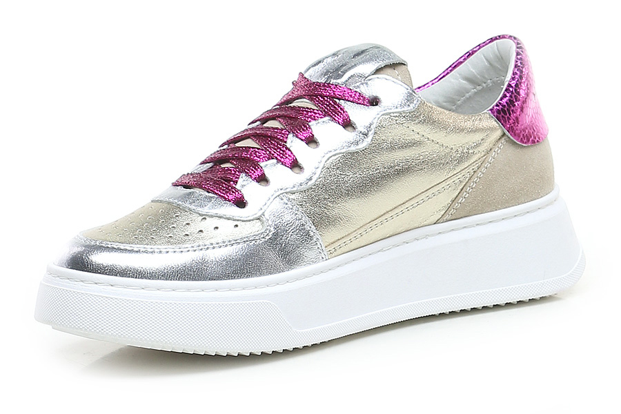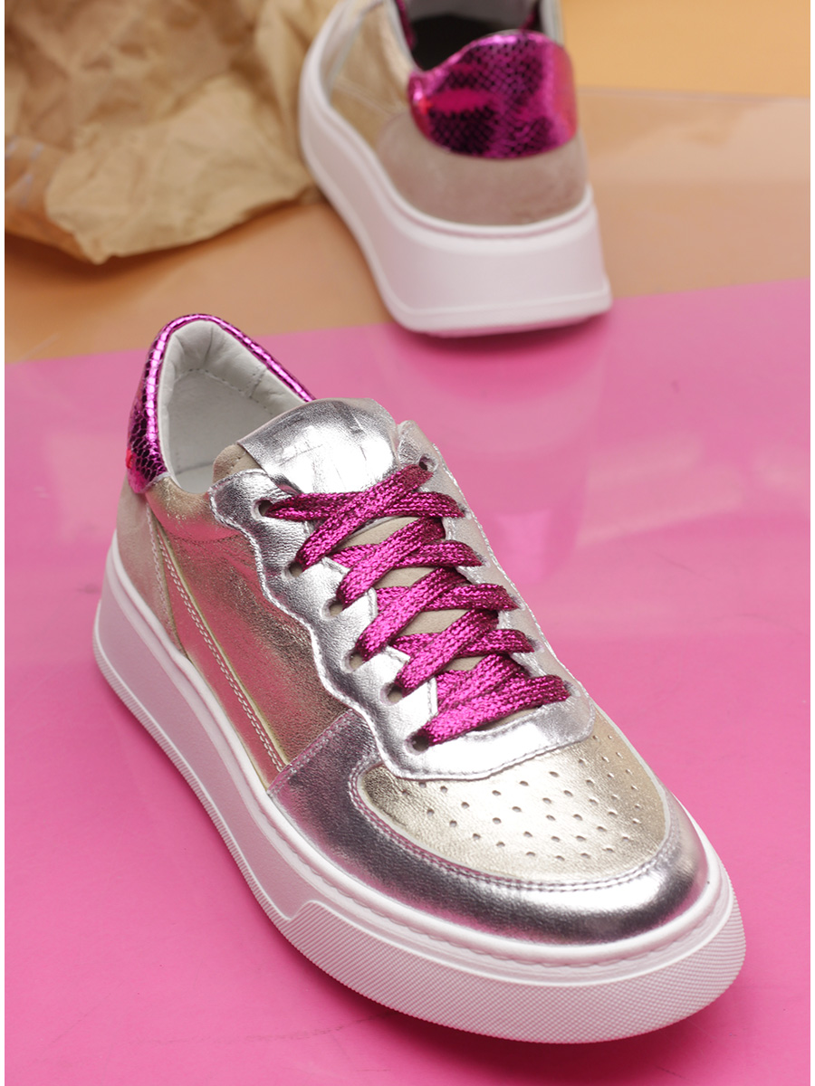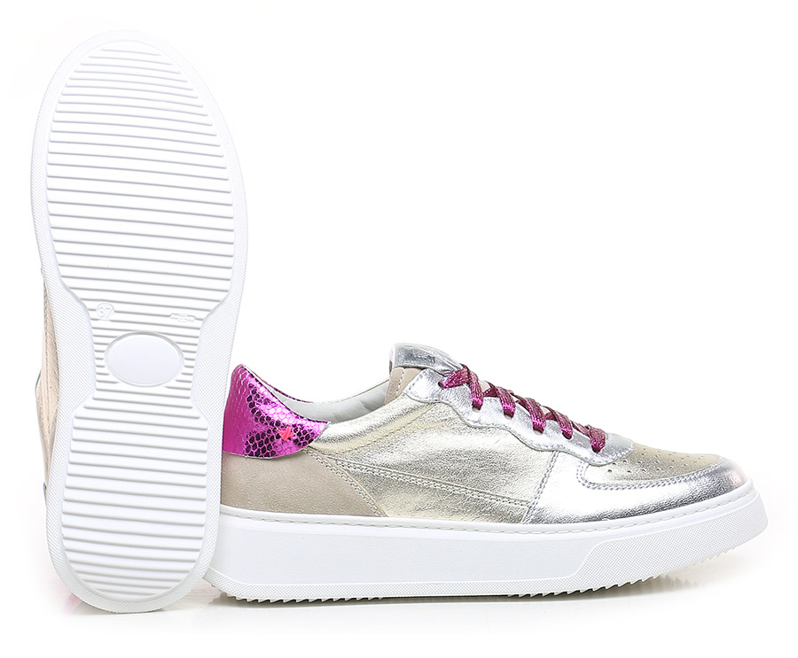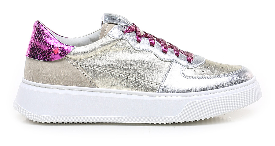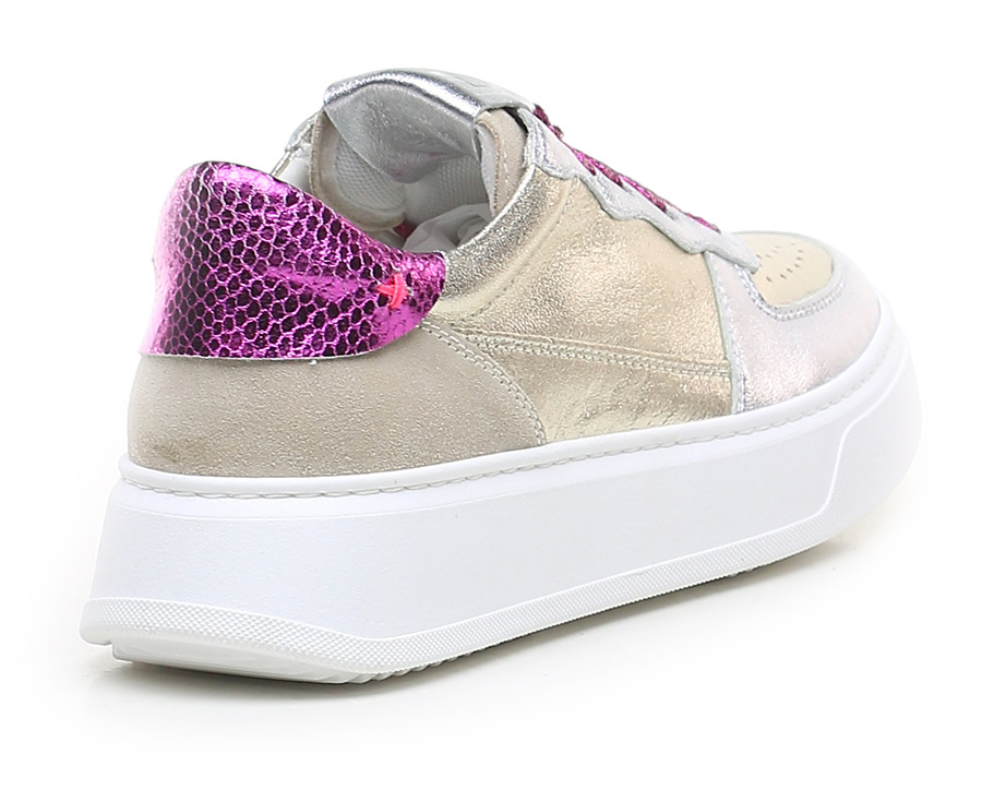 Sneaker in pelle laminata e camoscio con talloncino in pelle laminata stampa pitone. Suola in gomma. Altezza tacco 35mm, platform 30mm con battuta 5mm.