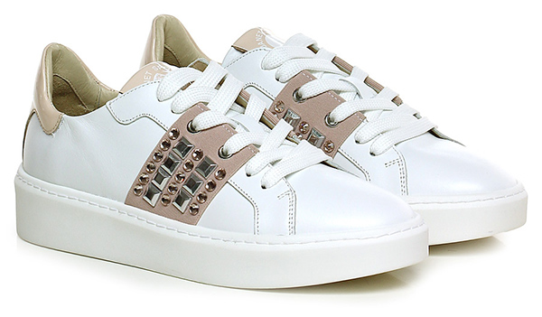 Sneaker in pelle ed eco pelle con pietre e strass su tomaia. Suola in gomma, tacco 40, platform 30 con battuta 10.