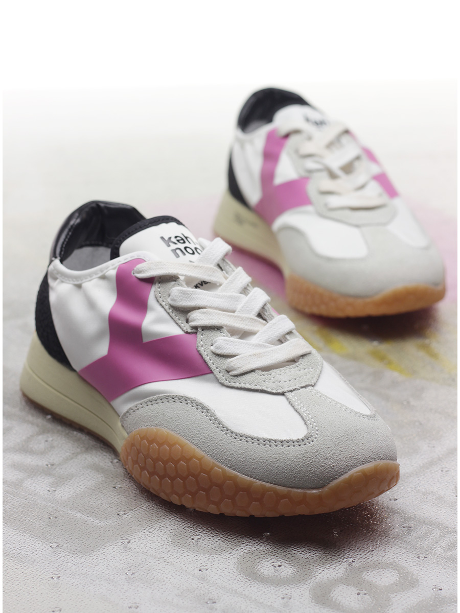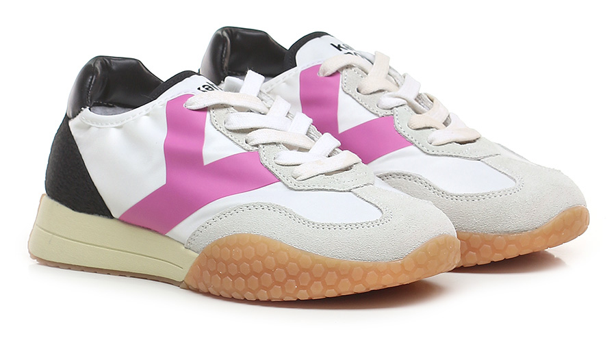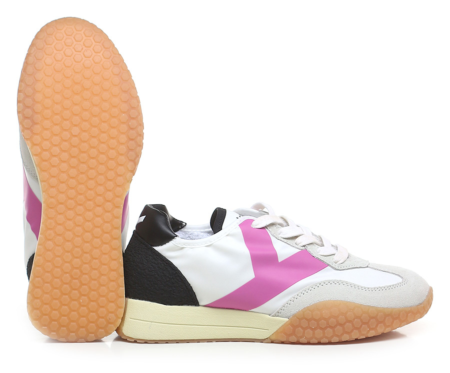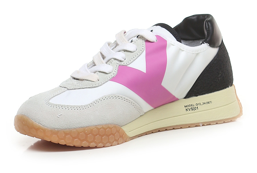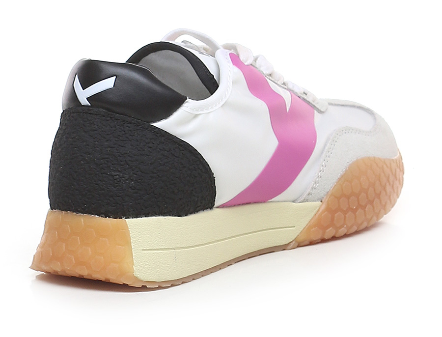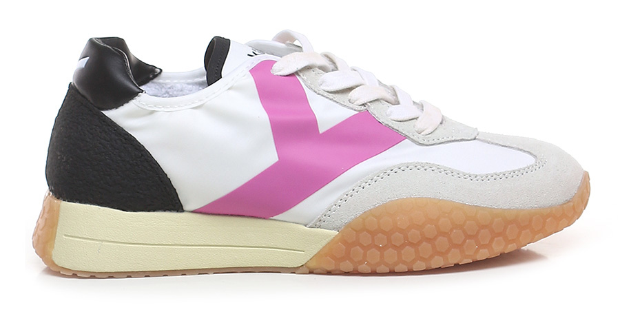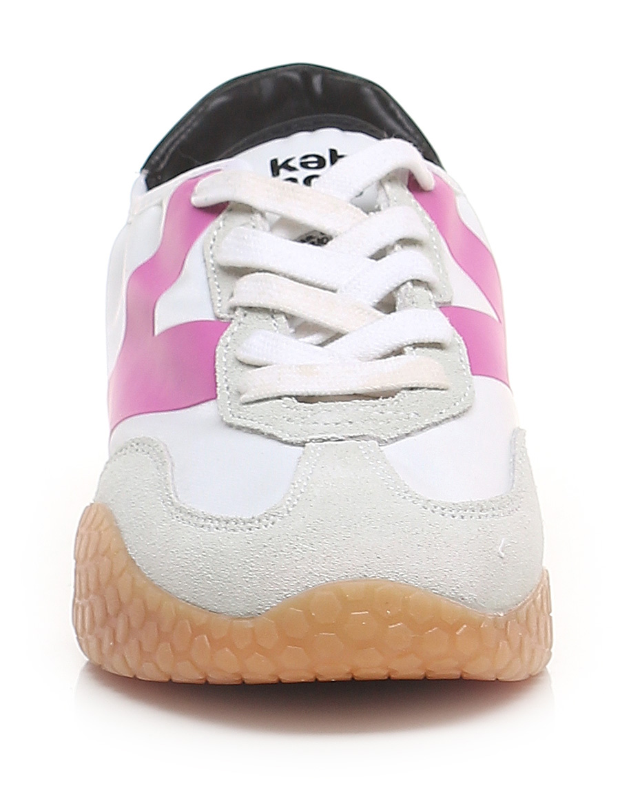 Sneaker in tessuto e camoscio con talloncino in pvc e suola in gomma. Altezza tacco 35mm, platform 20mm con battuta 15mm.
