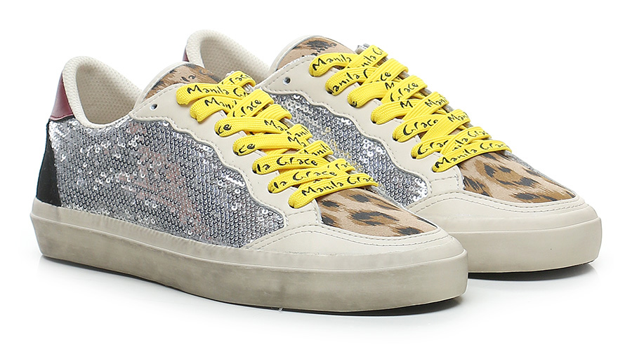 Sneaker in pailettes, pelle e nabuk con suola in gomma effetto vintage. Altezza suola 25mm.