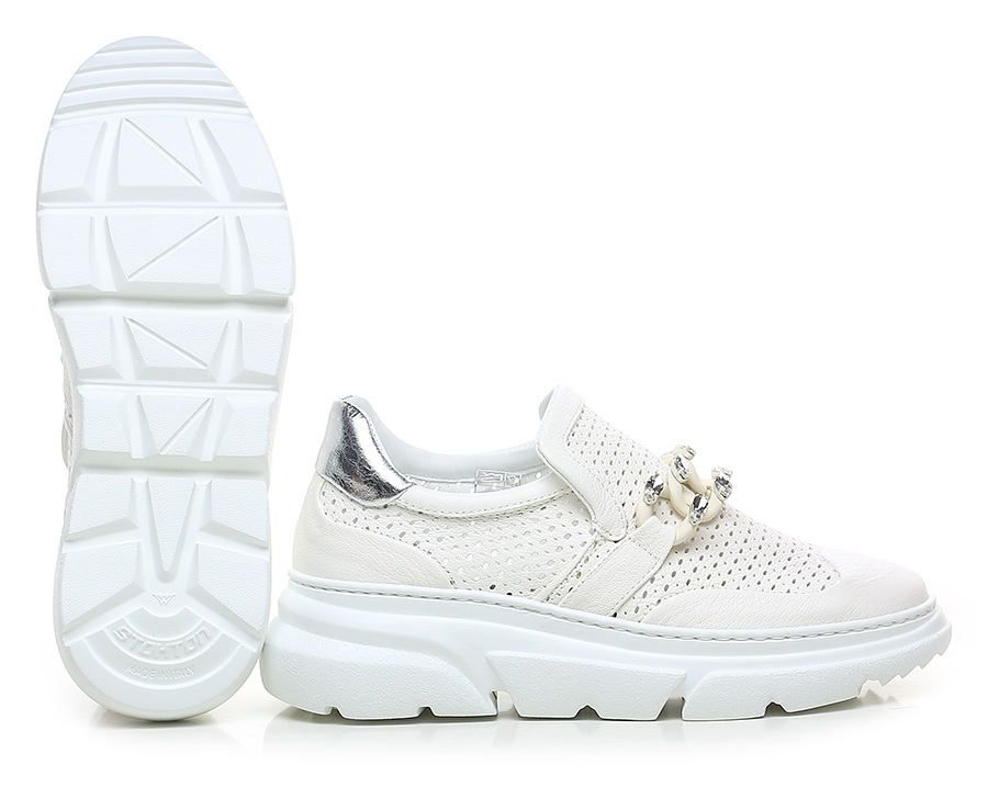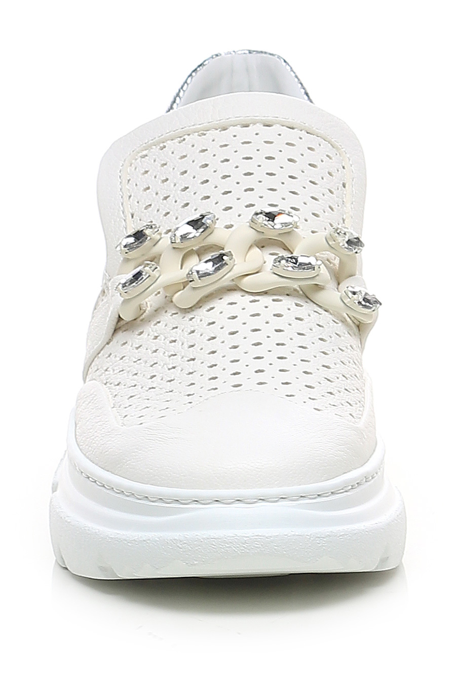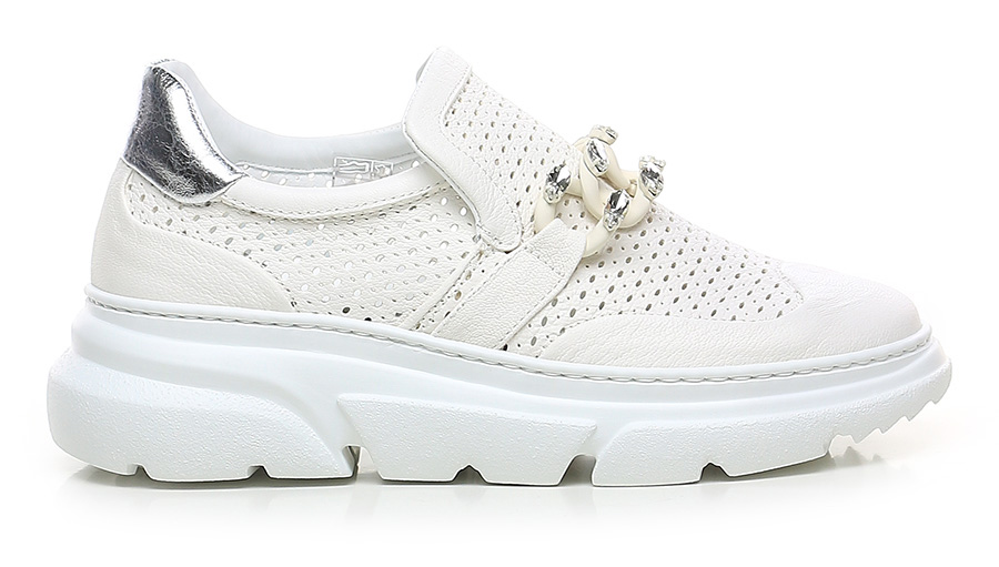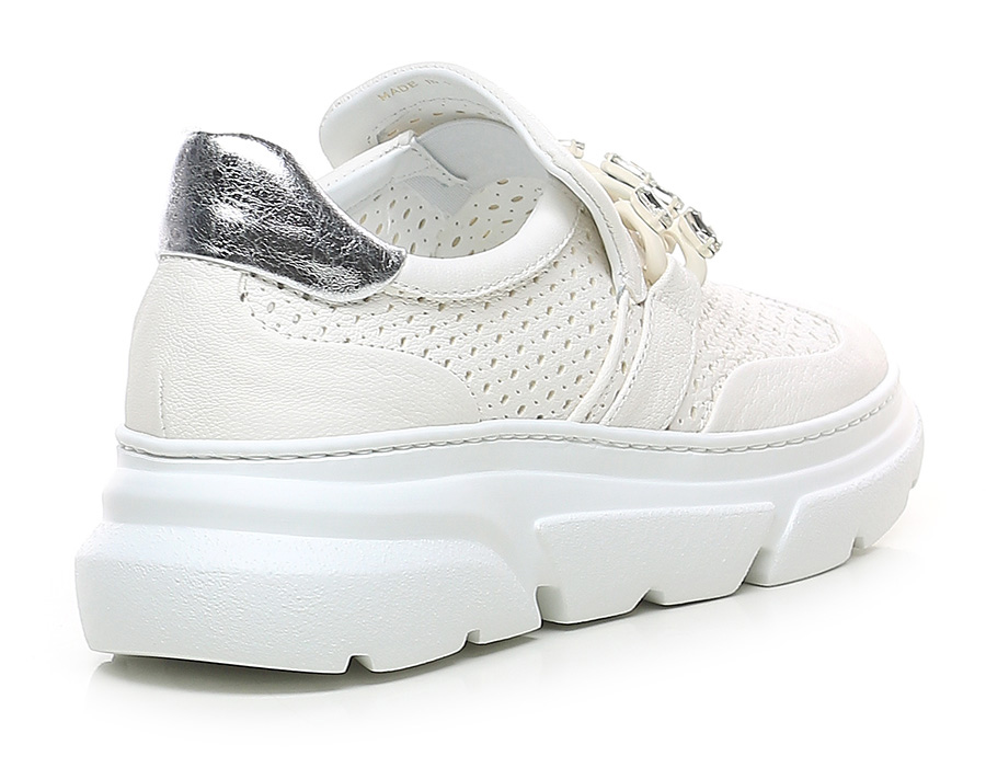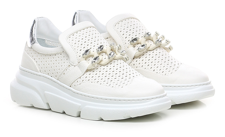 Sneaker in pelle traforata e pelle con talloncino in pelle laminata e accessorio frontale metallico gold con pietre. Suola in gomma. Altezza tacco 50mm, platform 35mm con battuta 15mm.