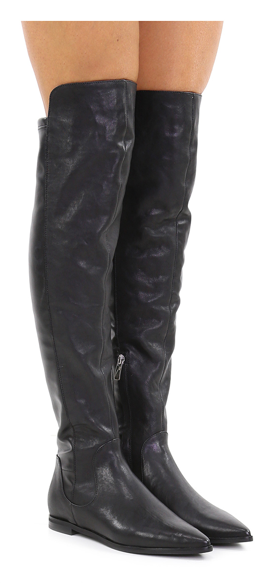 Stivale in pelle vintage ed eco pelle stretch con retro gambale elasticizzato e zip su lato interno. Suola in gomma, tacco 30, platform 15 con battuta 15. Altezza gambale 530.