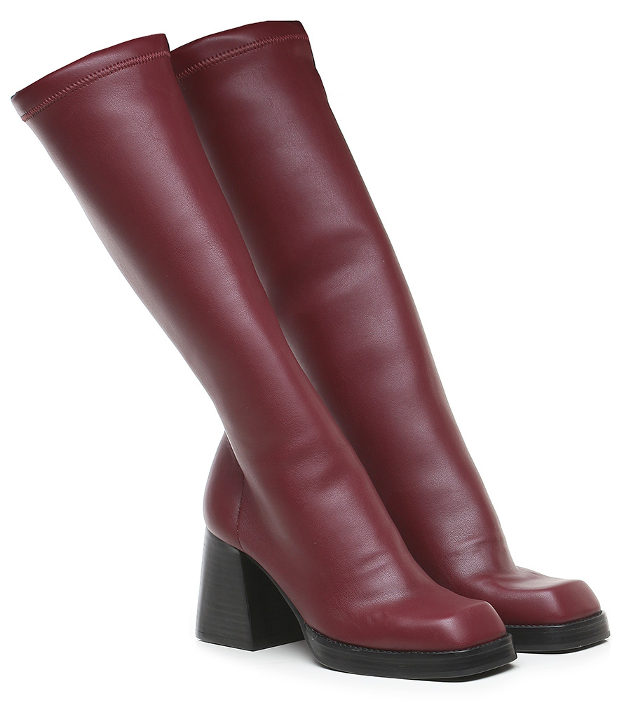 Stivale in ecopelle stretch con suola in gomma: altezza tacco 80mm. Tacco effetto legno. Altezza gambale 33cm.