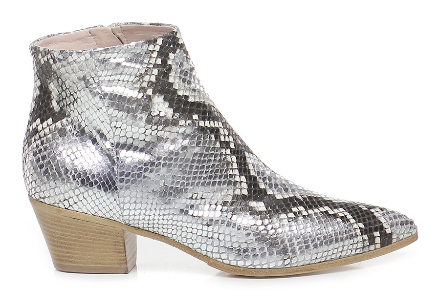 Tronchetto in pelle laminata effetto pitone, zip lato interno, suola in cuoio. Tacco 50,effetto legno.