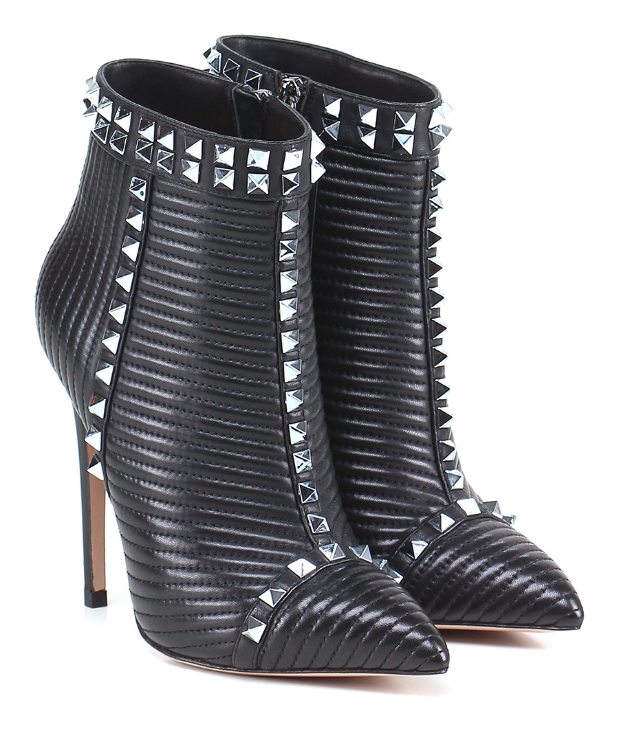 Tronchetto in pelle con zip su lato interno e borchie su tomaia. Suola in cuoio, tacco 115, platform 15 con battuta 100.