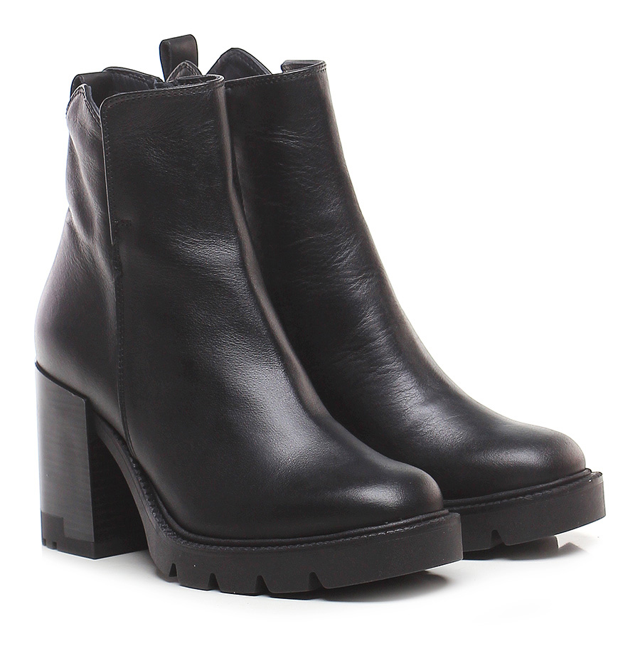 Tronchetto in pelle con zip laterale. Suola in gomma carrarmato: altezza tacco 90mm, platform 25mm con battuta di 65mm. Tacco effetto legno.