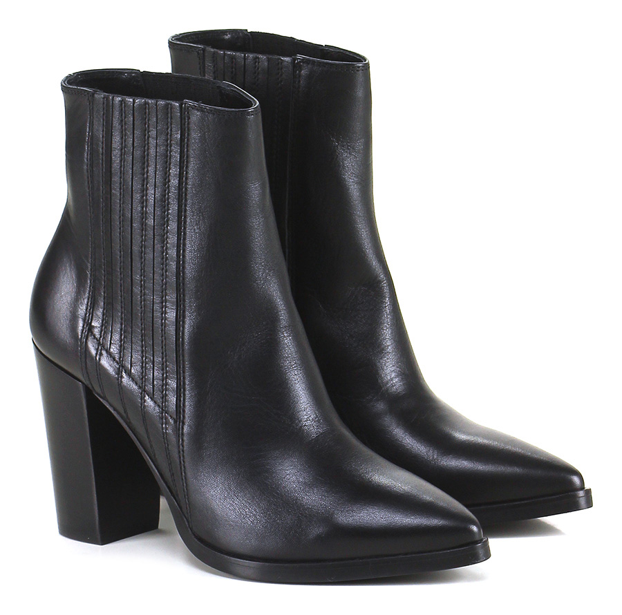 Tronchetto in pelle con fasce elasticizzate a scomparsa su ambo i lati. Suola in cuoio e gomma, tacco 95.