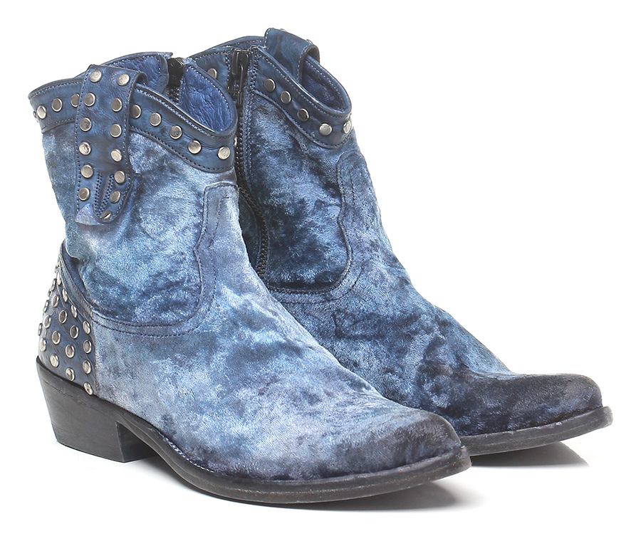 Tronchetto in velluto e pelle vintage con zip su lato interno ed applicazione borchie su tomaia. Tacco 45.