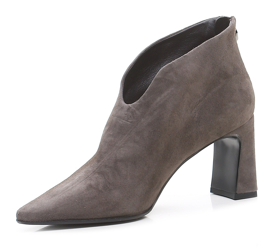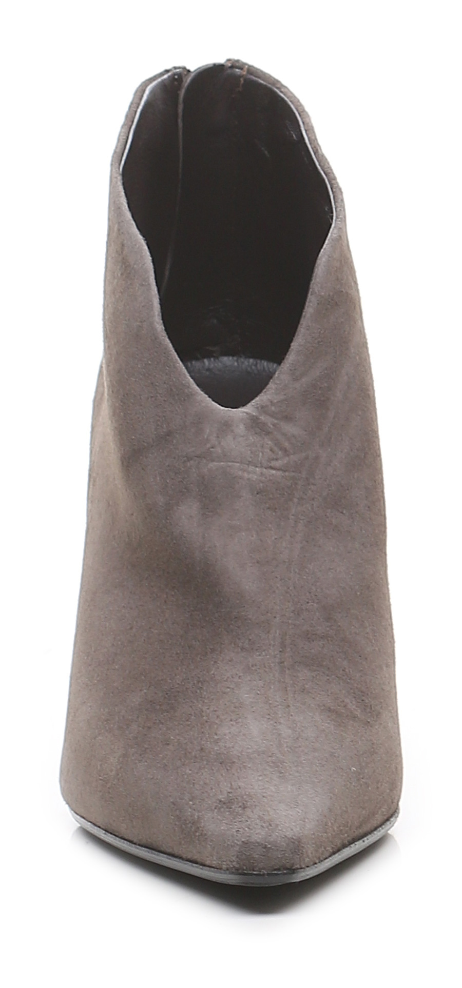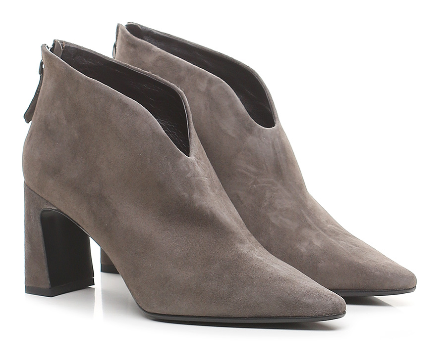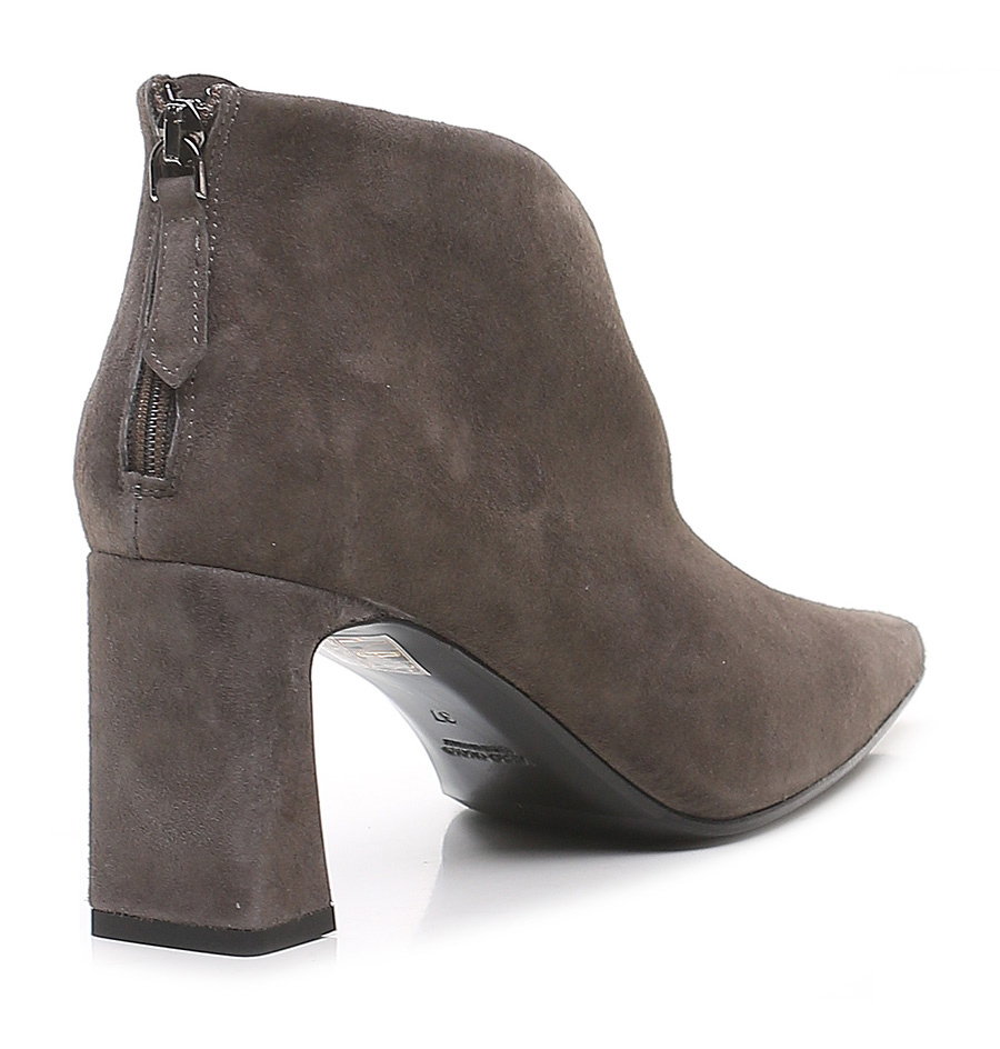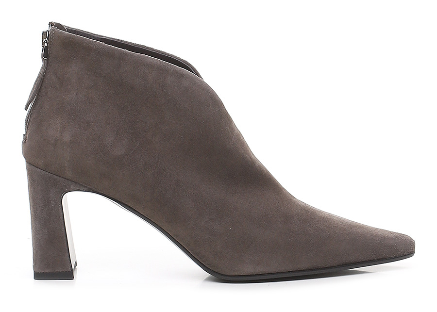 Tronchetto in camoscio con zip retro. Suola in cuoio e gomma: altezza tacco 75mm. Tacco foderato in camoscio.