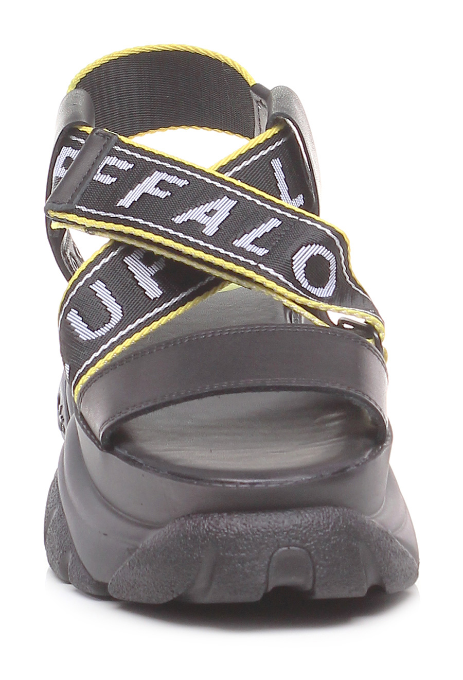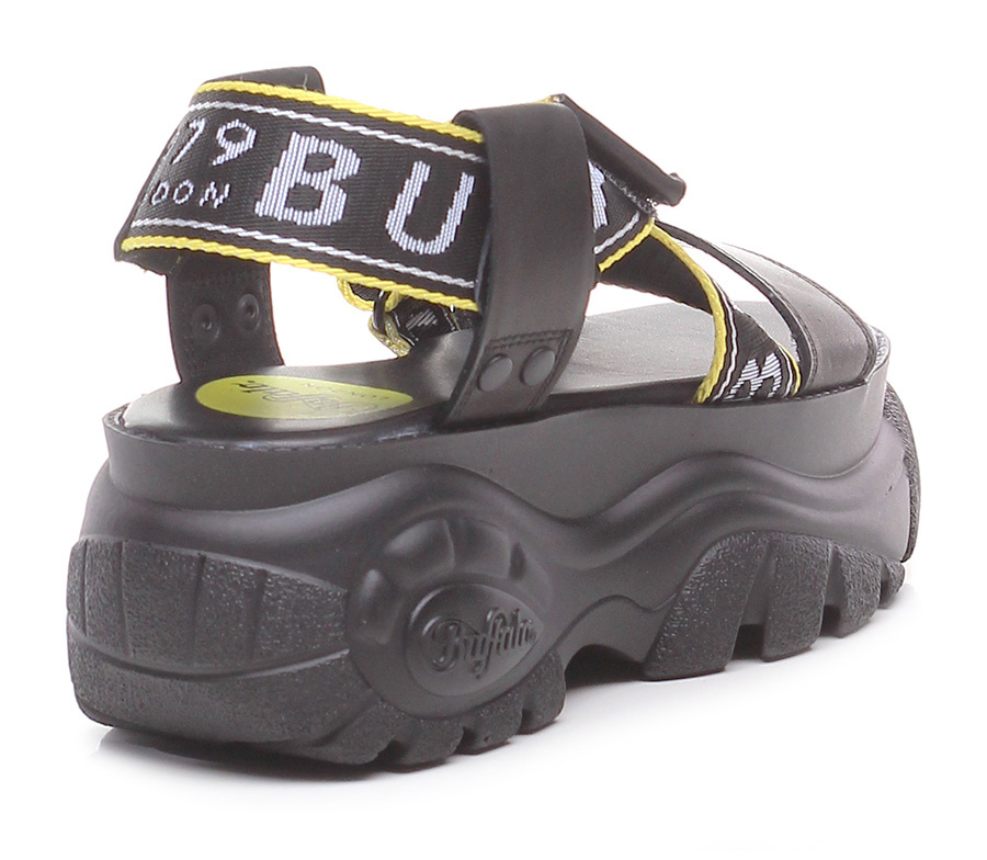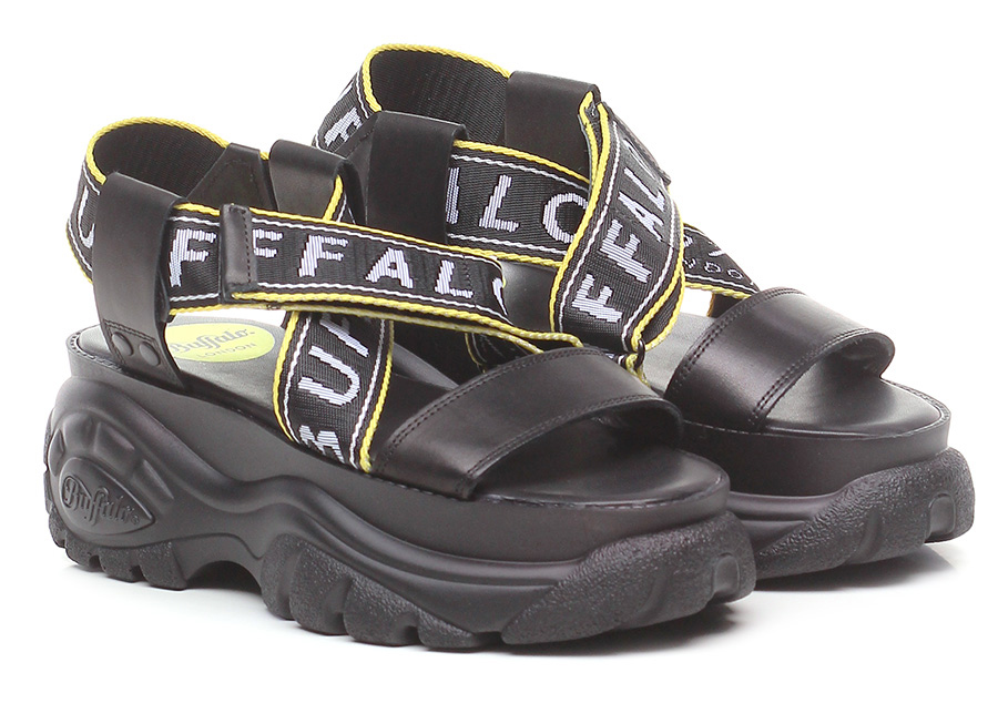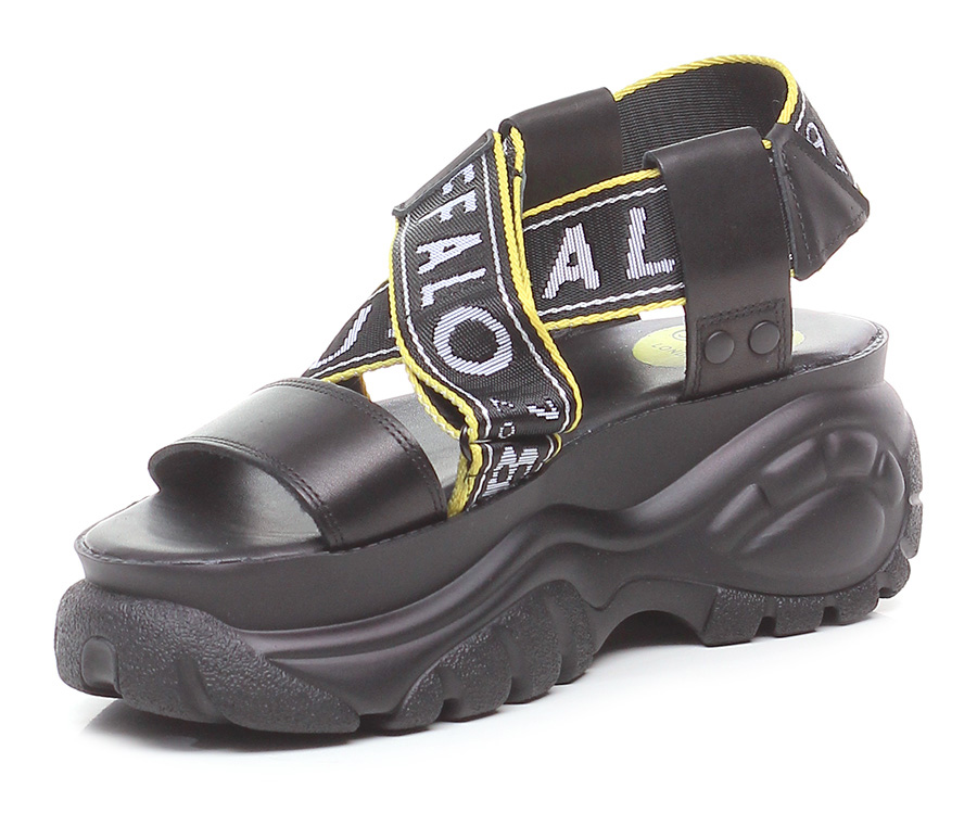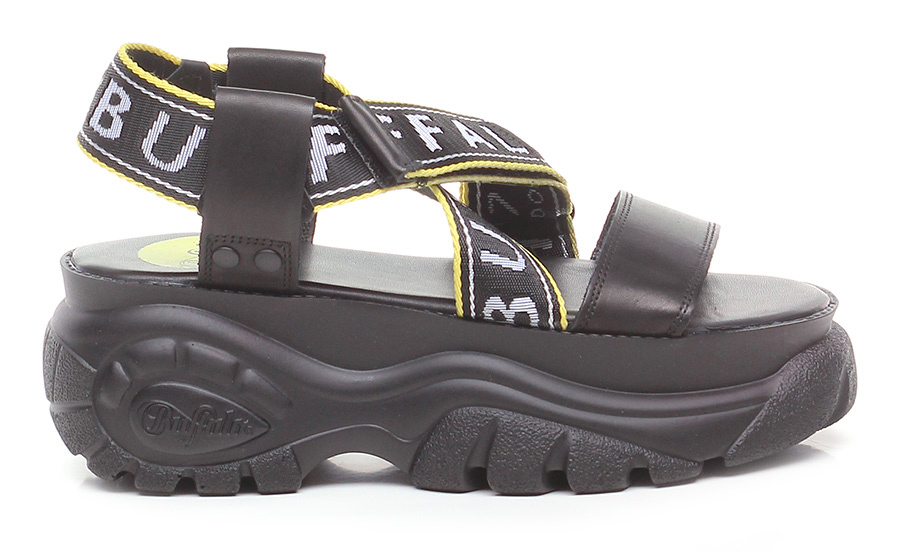 Zeppa in pelle e tessuto con cinturino su retro, chiusura a strappo, suola in gomma Tacco 70, platform 50 con battuta 20.