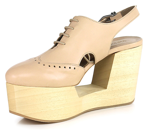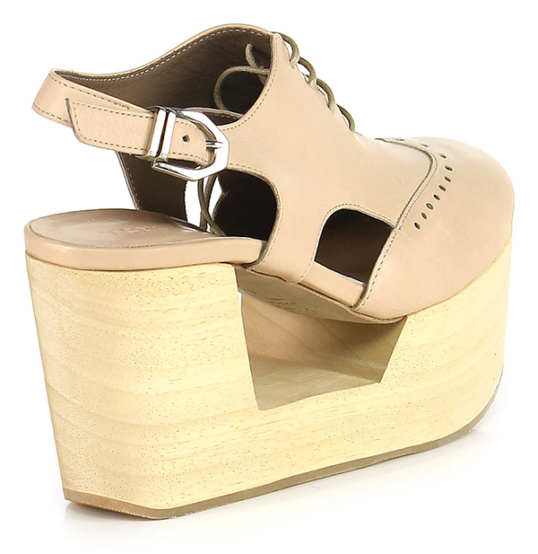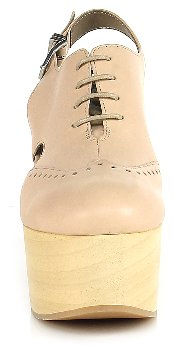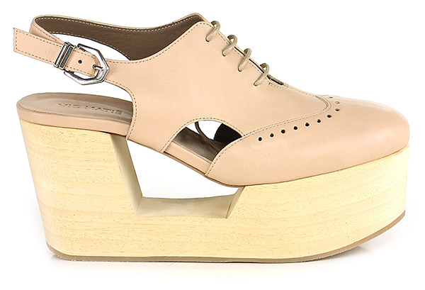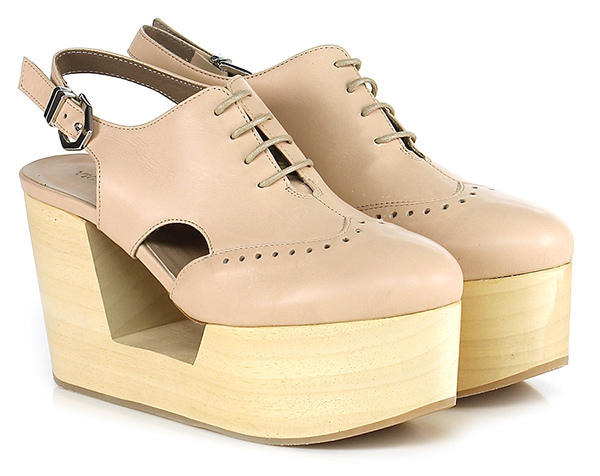 Scarpa bassa in pelle vintage con cinturino su retro e lavorazione stile inglese. Tacco 100, platform 55 con battuta 45. Zeppa in legno.