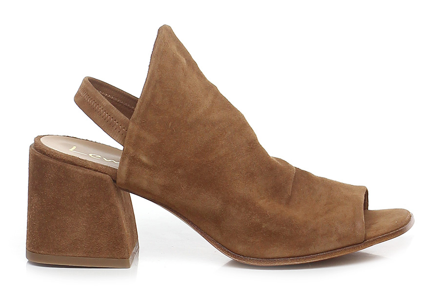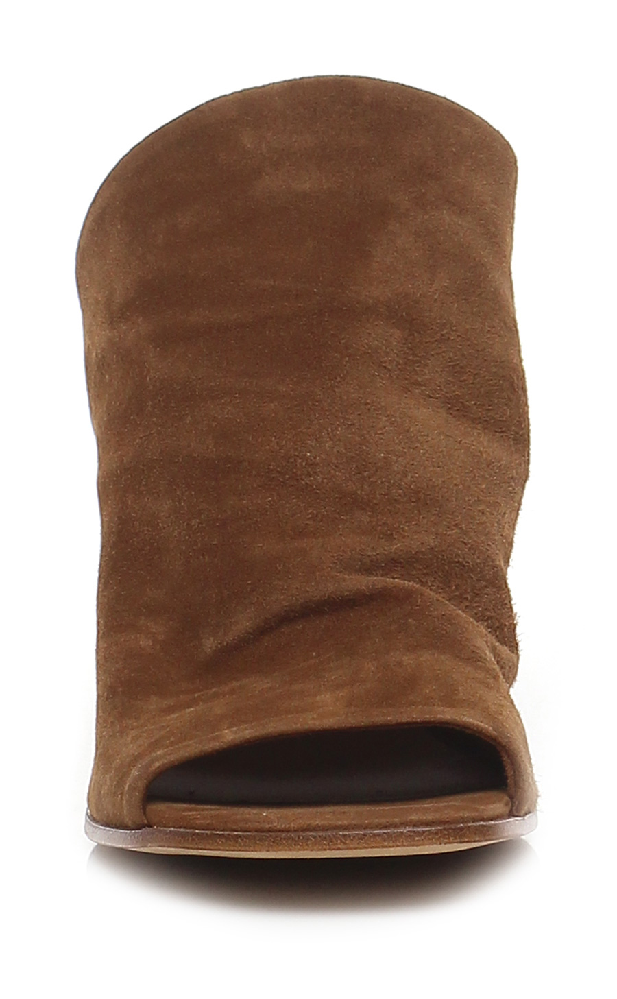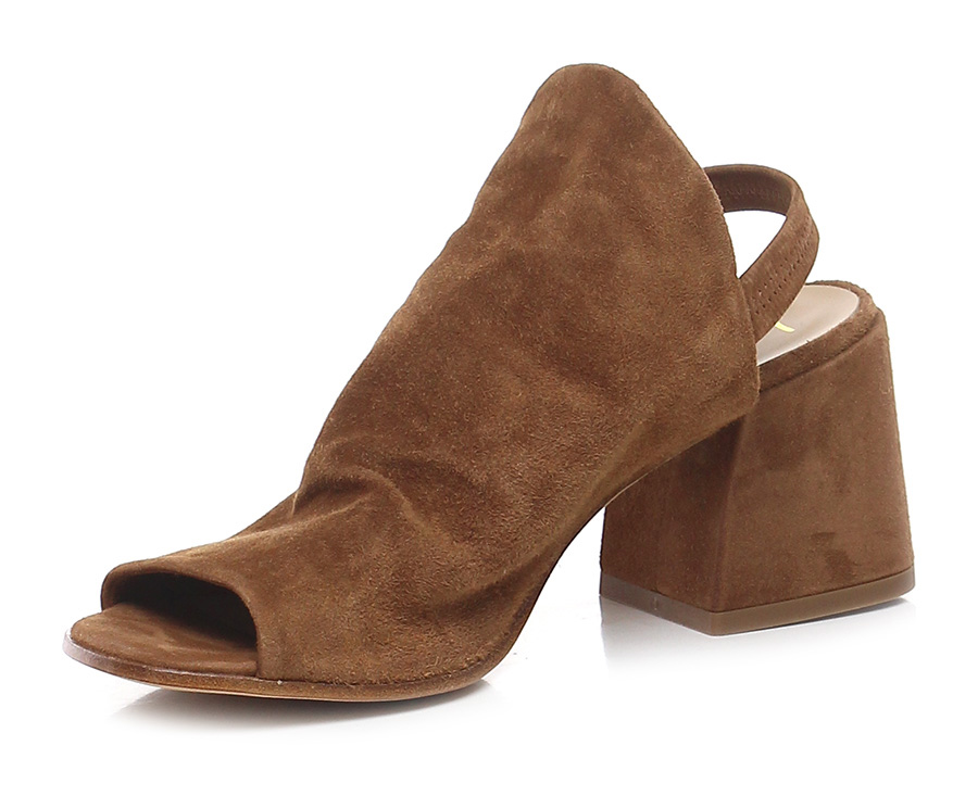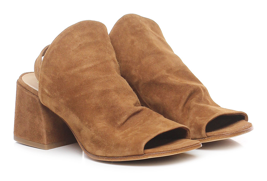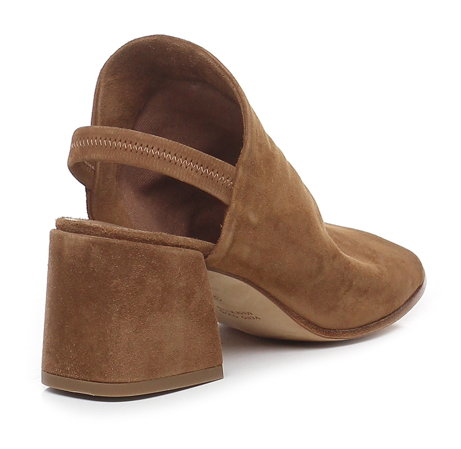 Sandalo basso in camoscio con cinturino sul retro elasticizzato. Tacco 75, rivestito in camoscio.