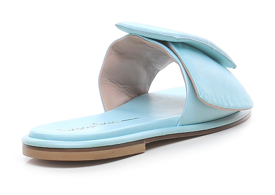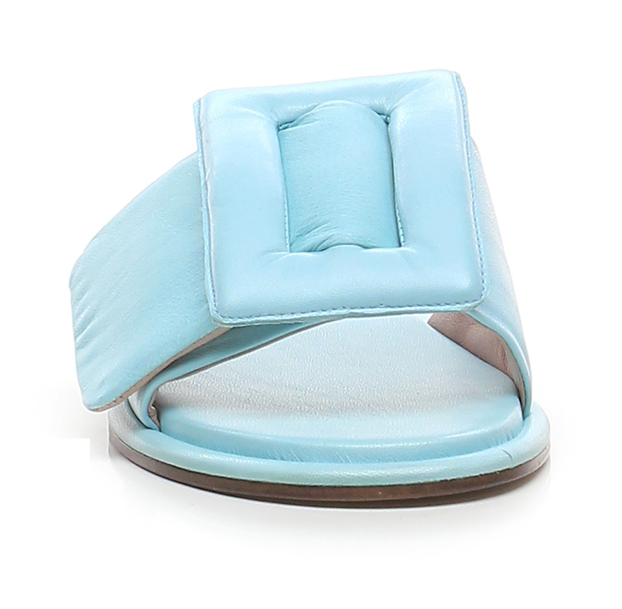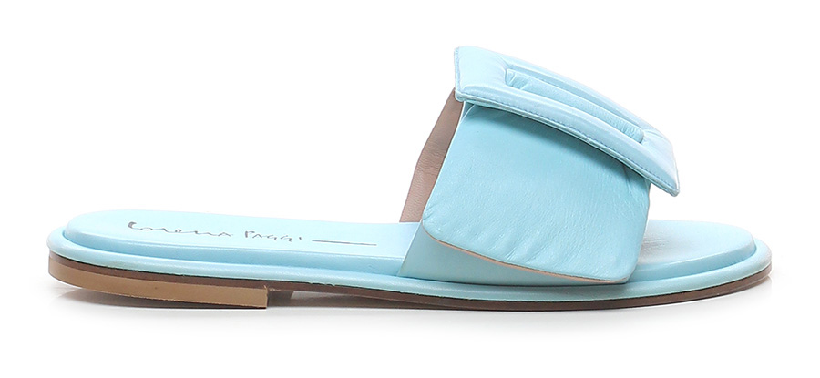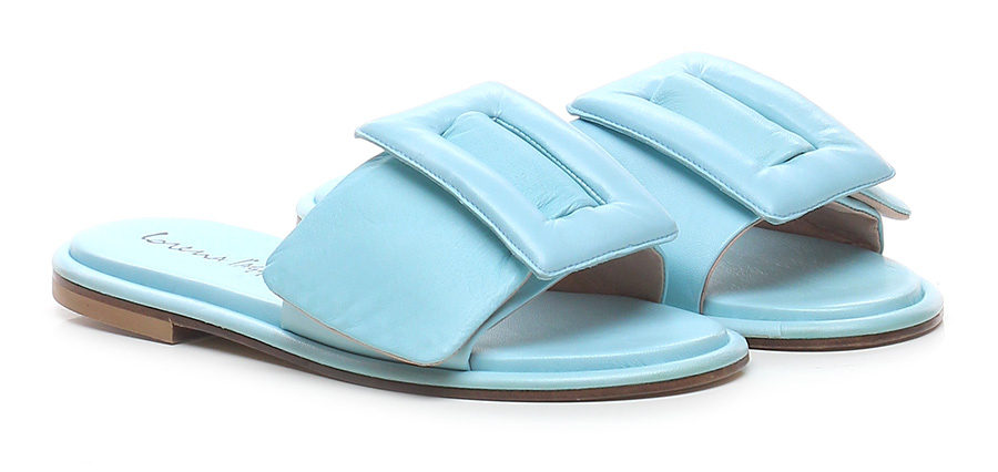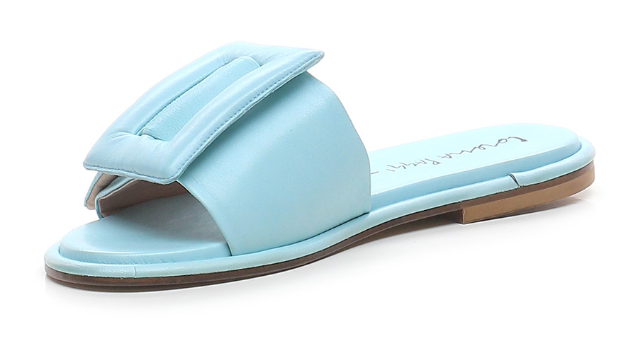 Sandalo basso in pelle a fascia con maxi fibbia imbottita, suola in cuoio e gomma. Tacco 15, Plantare morbido imbottito, punta tonda aperta.