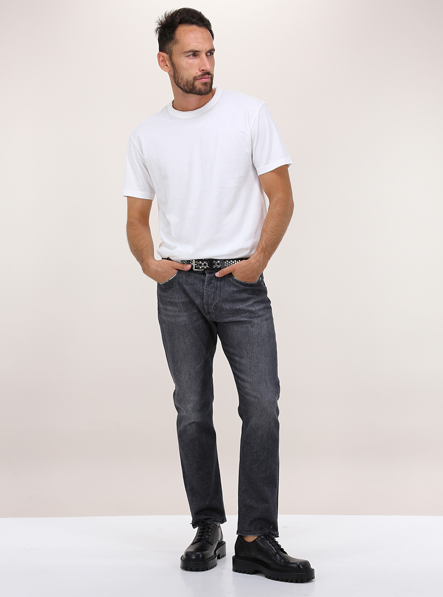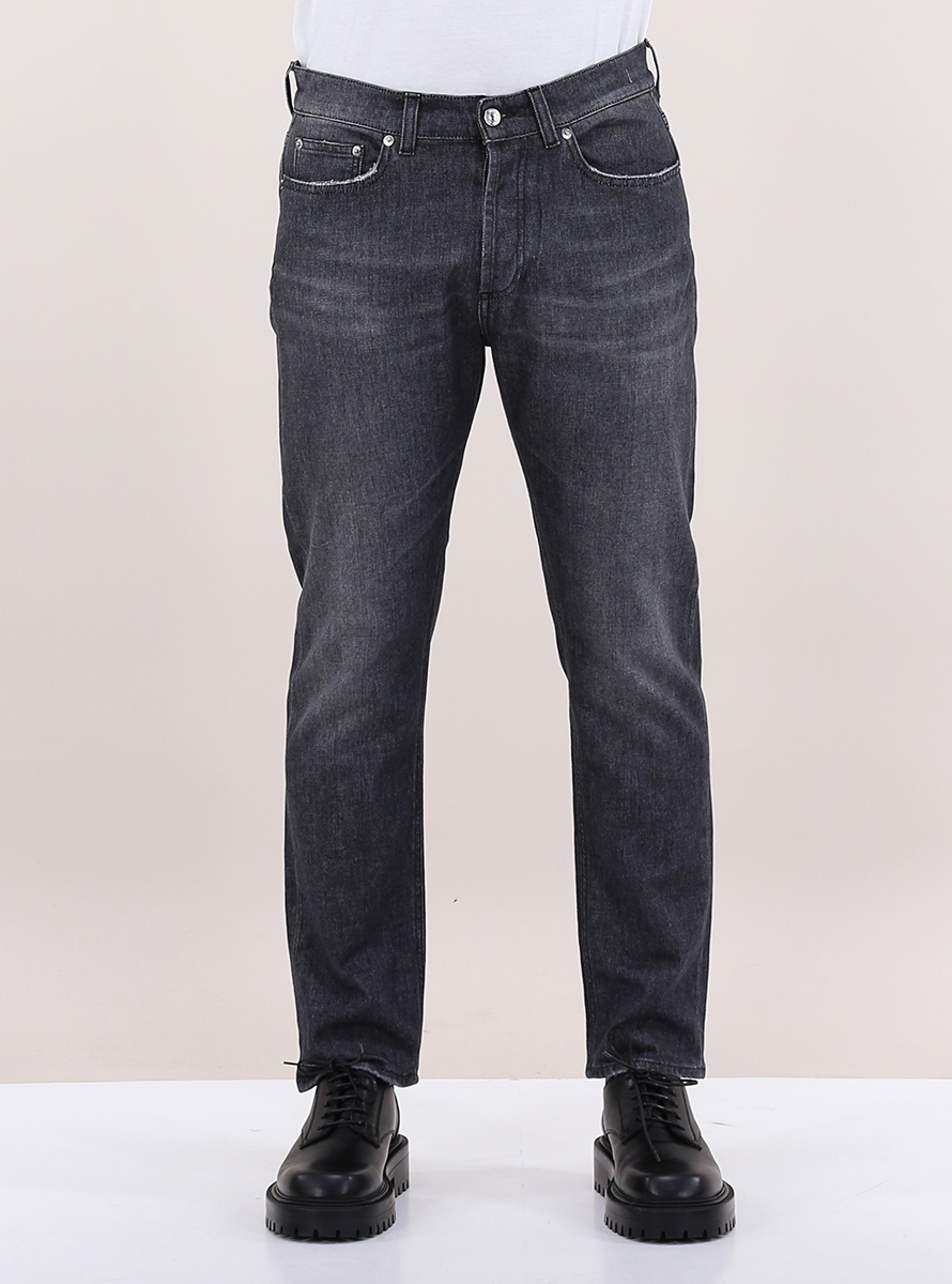 Jeans Grifoni modello "Pier" in denim di cotone stretch. Vestibilità cropped fit. Il modello è alto 1,80 e indossa la taglia 32.