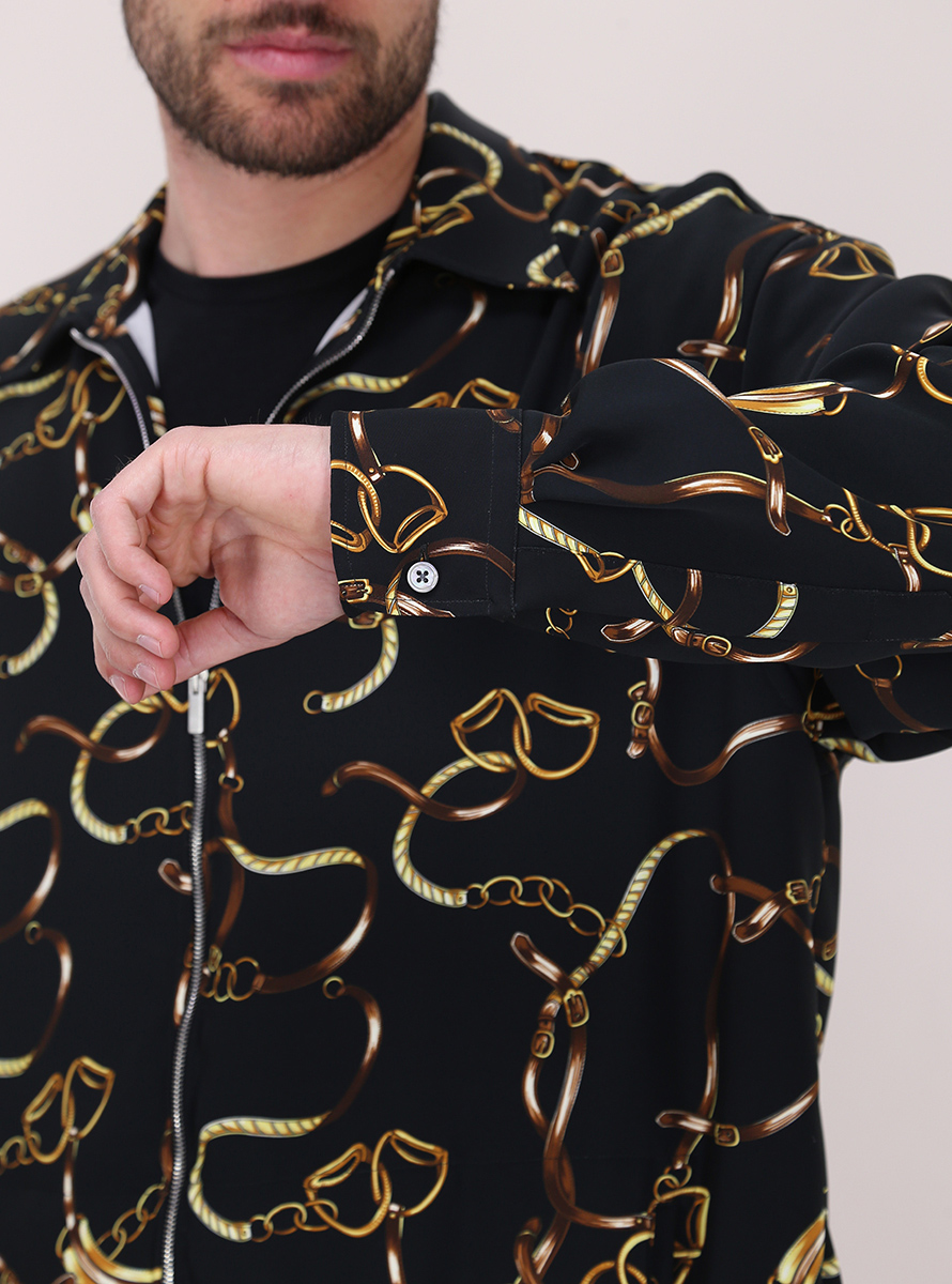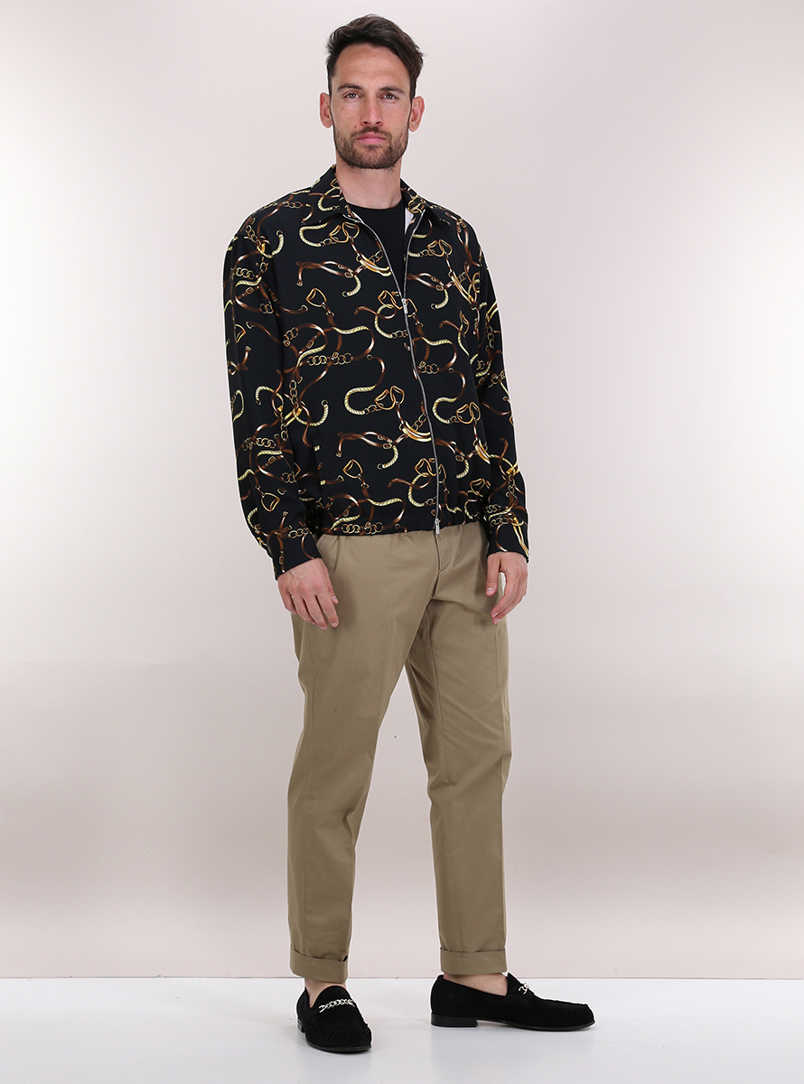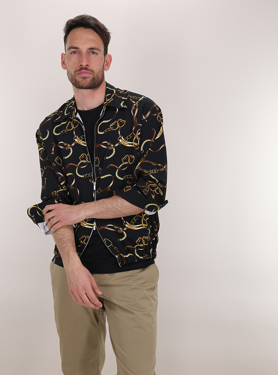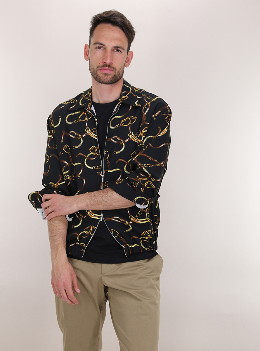 Giacca camicia Pt sfoderata a maniche lunghe con collo e polsini a camicia. Zip di chiusura frontale a doppio cursore e tasche a filo laterali. Cannoncino sul retro ed elastico sul fondo. Fantasia catene e briglie. Il modello è alto 1.80 ed indossa la taglia 40.