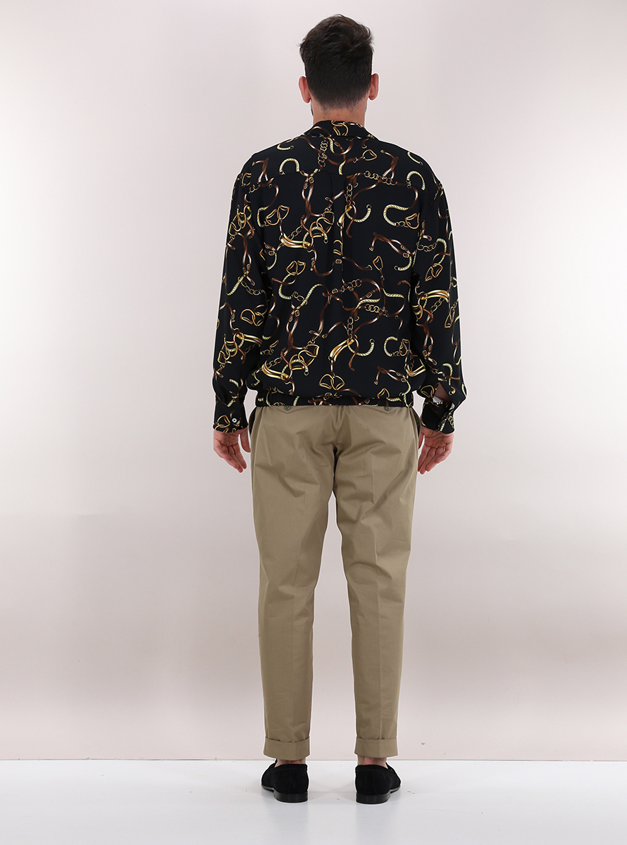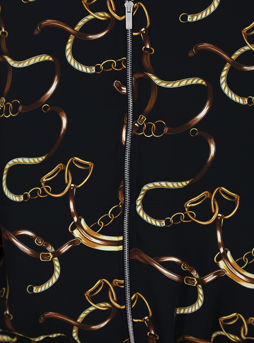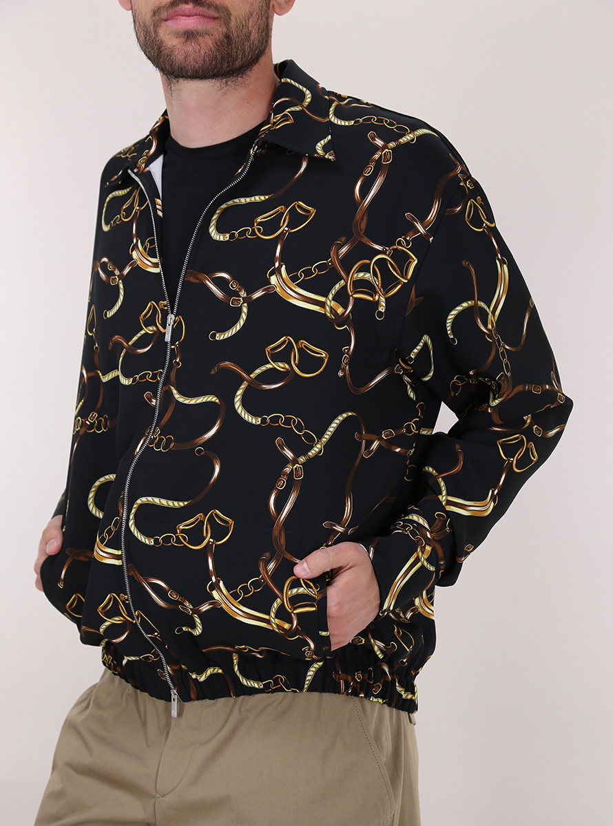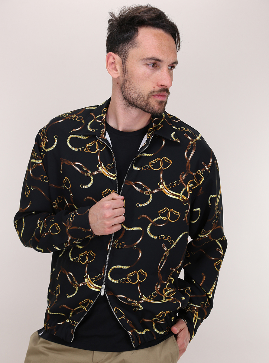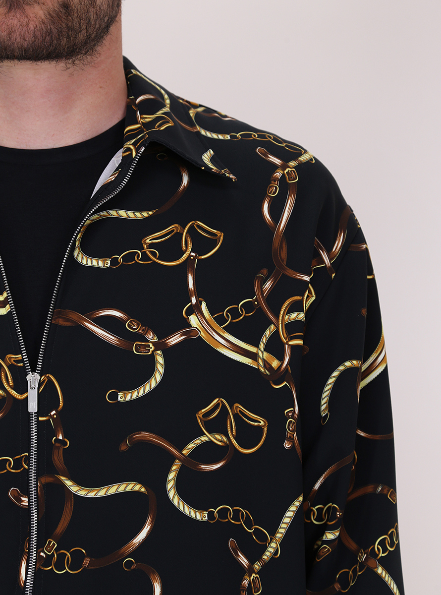 Giacca camicia Pt sfoderata a maniche lunghe con collo e polsini a camicia. Zip di chiusura frontale a doppio cursore e tasche a filo laterali. Cannoncino sul retro ed elastico sul fondo. Fantasia catene e briglie. Il modello è alto 1.80 ed indossa la taglia 40.