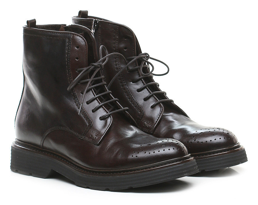 Polacco in pelle spazzolata effetto vintage con zip laterale e lavorazione a coda di rondine. Suola in gomma. Altezza tacco 35mm, platform 20mm con battuta 15mm.