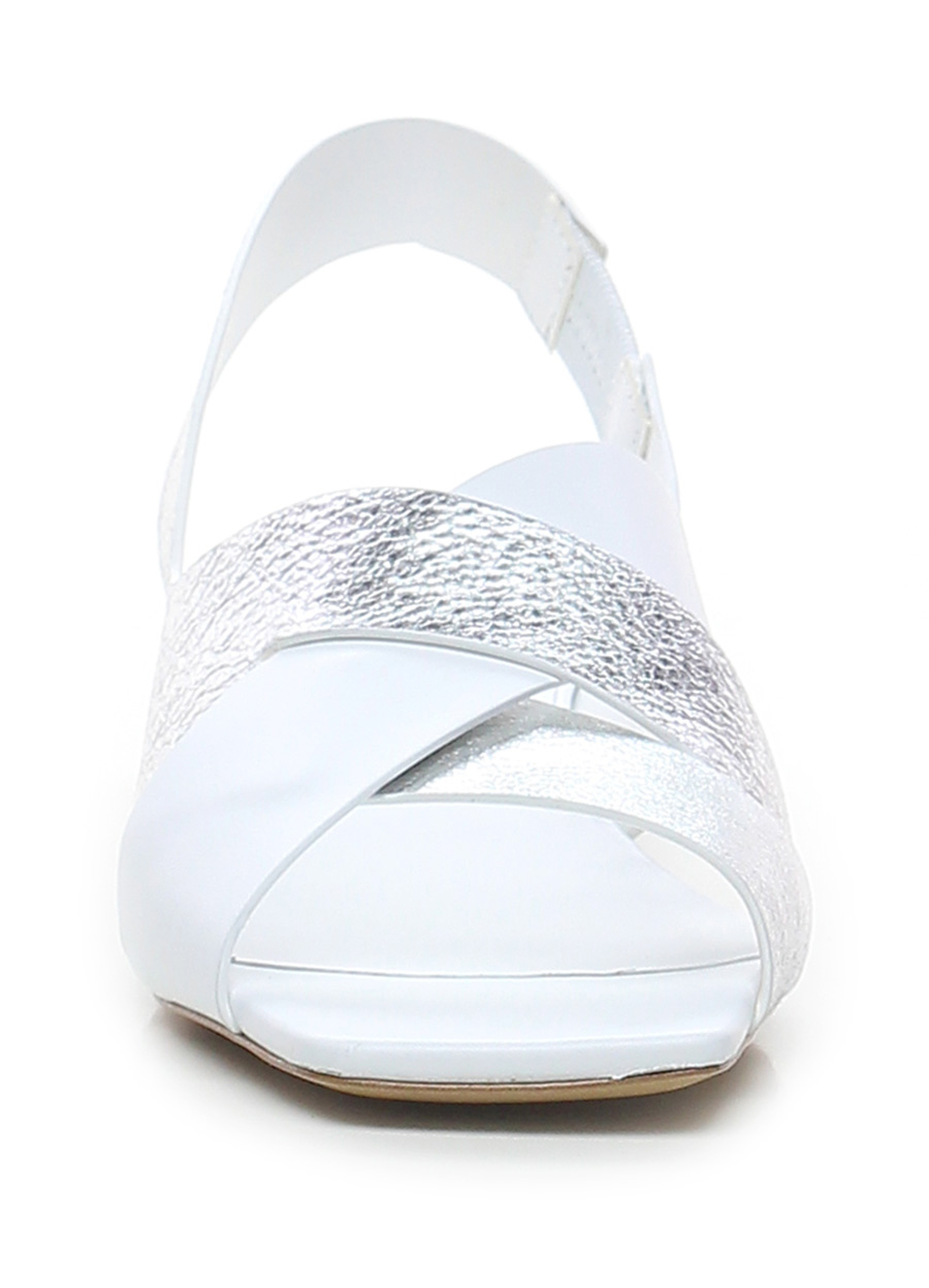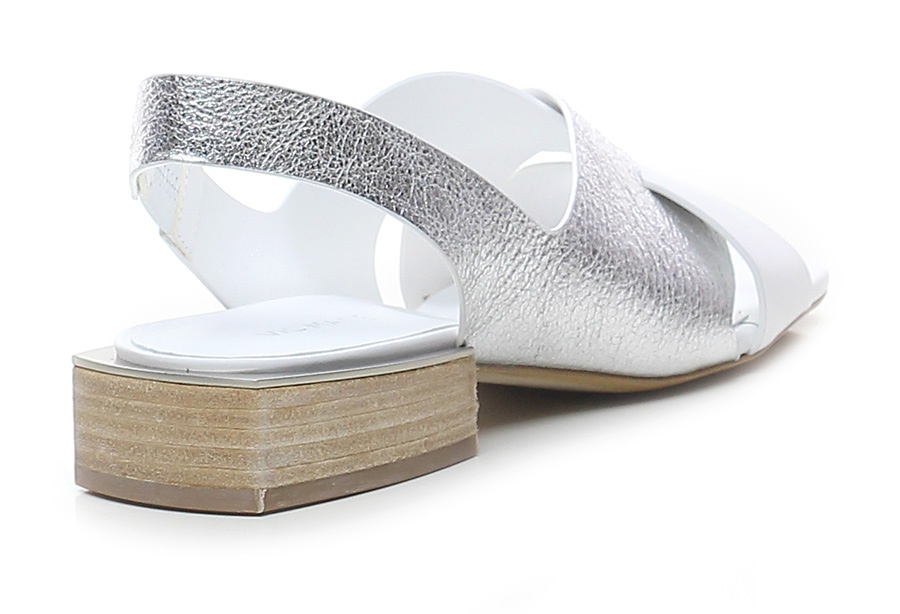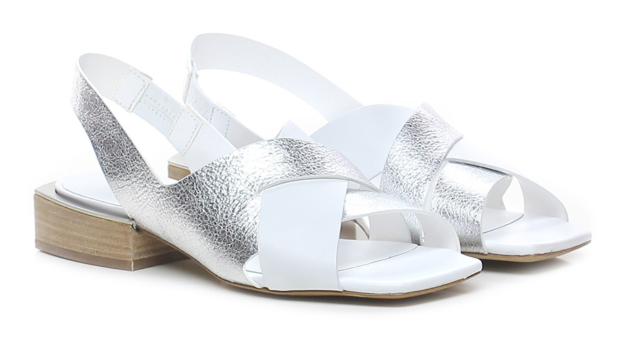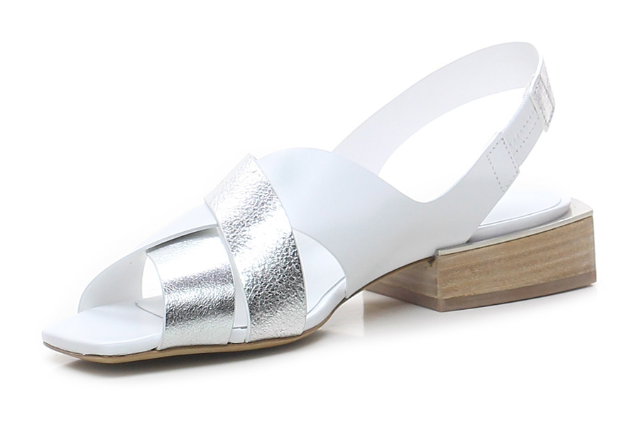Sandalo basso in pelle a incrocio in pelle laminata con cinturino sul dietro con inserto elasticizzato lato interno, suola in cuoio. Tacco 30, scolpito effetto legno e metallo. Punta aperta squadrata.