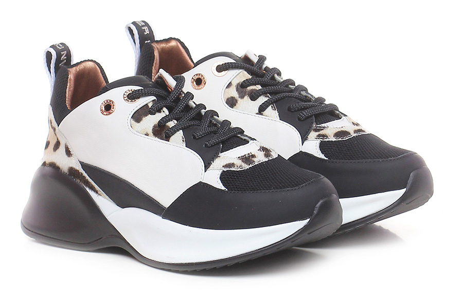 Sneaker in pelle, cavallino e tessuto, suola oversize. Altezza suola: 55, platform 30 con battuta 25.