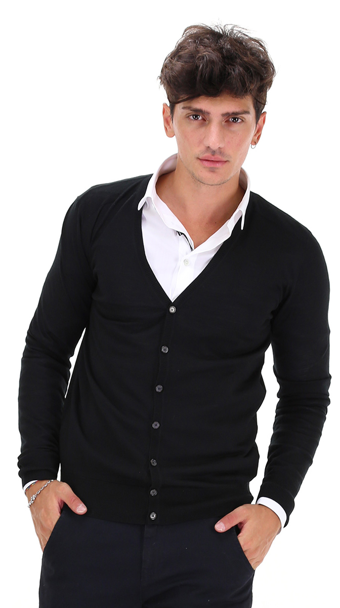 Maglia cardigan in lana extrafine, con bottoni e con vestibilità regular. Il modello è alto 1,82 e indossa la taglia M.