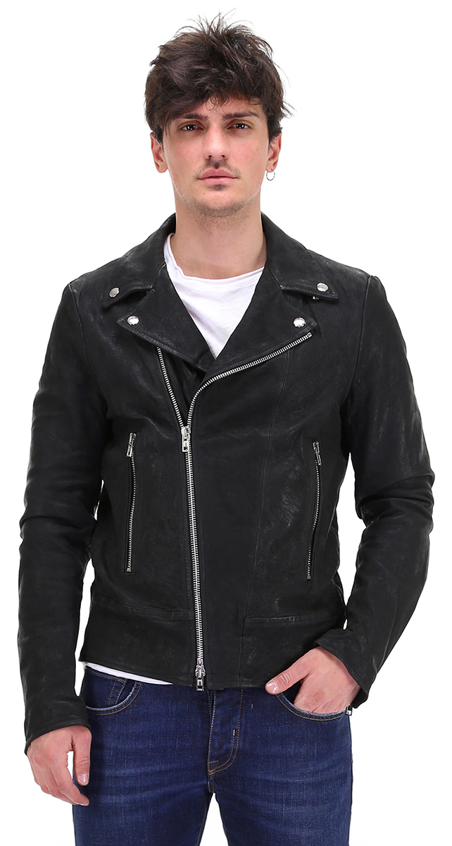 Chiodo in pelle lavata con fodera in viscosa. Maniche lunghe e tasche a sacchetto. Il modello è alto 1.82 ed indossa la taglia 52.