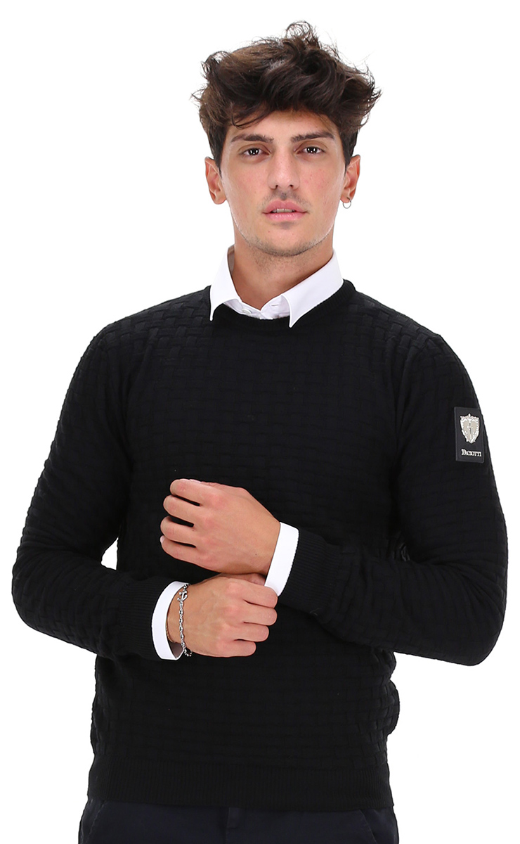 Maglia girocollo in lana merinos extrafine, con lavorazione e logo a placchetta su manica sinistra. Vestibilità slim .Il modello è alto 1,82 e indossa la taglia M.