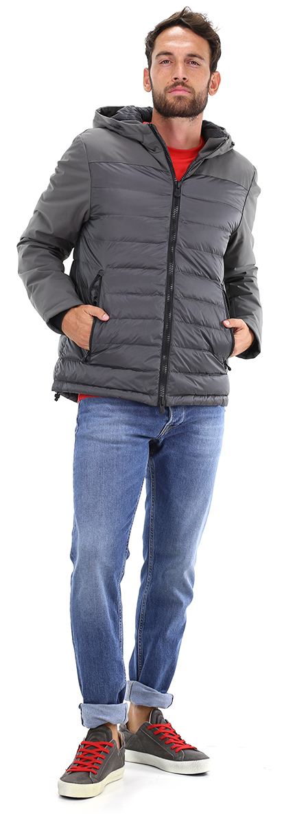 Piumino People Of Shibuya trapuntato con isolante termico "3M Thinsulate". Imbottitura sof shell. Water repellency. Maniche lunghe in tessuto tecnico e collo a cappuccio. Tasche frontali e zip di chiusura. Coulisse sul fondo. Il modello è alto 1,80 cm ed indossa la taglia 48.