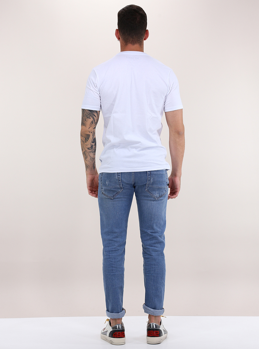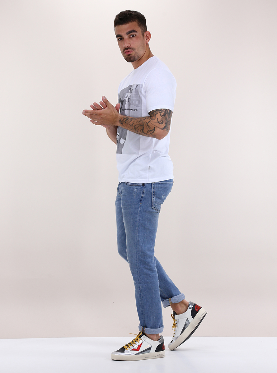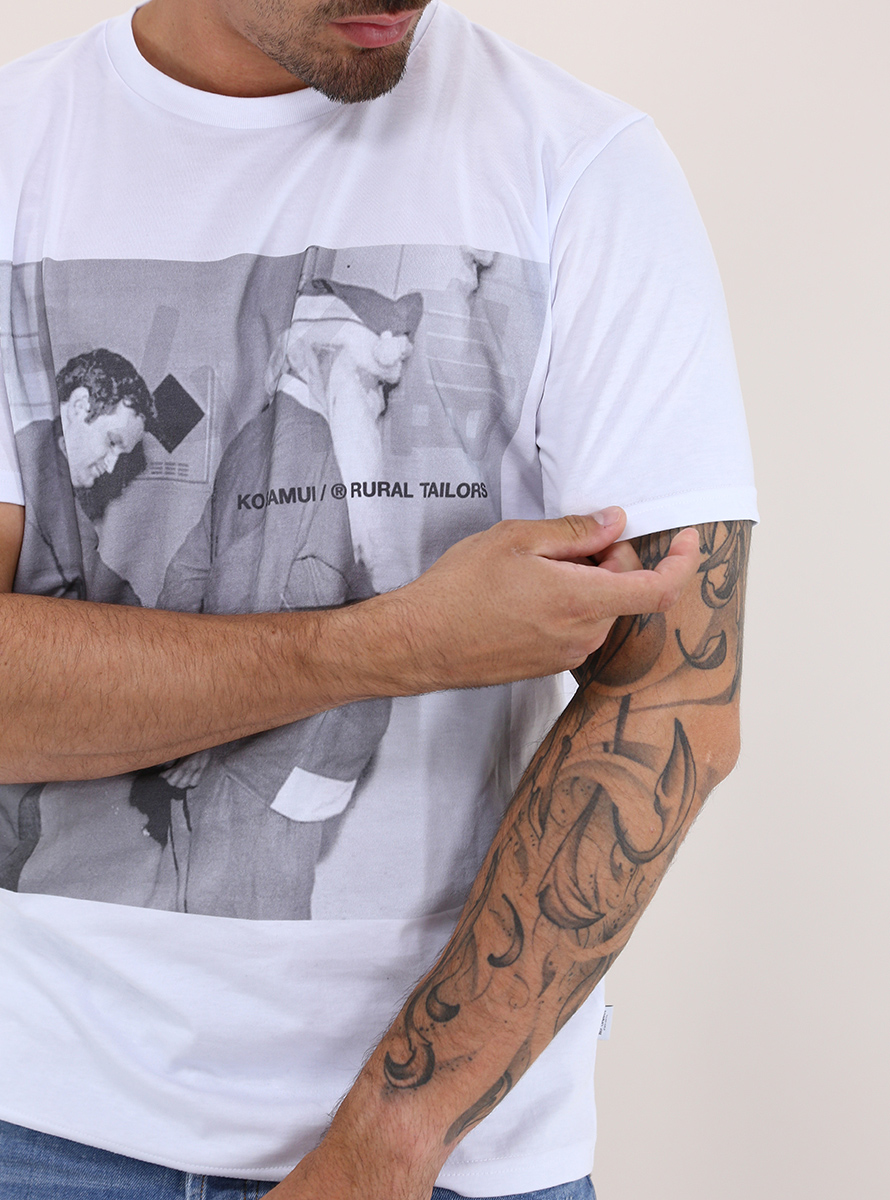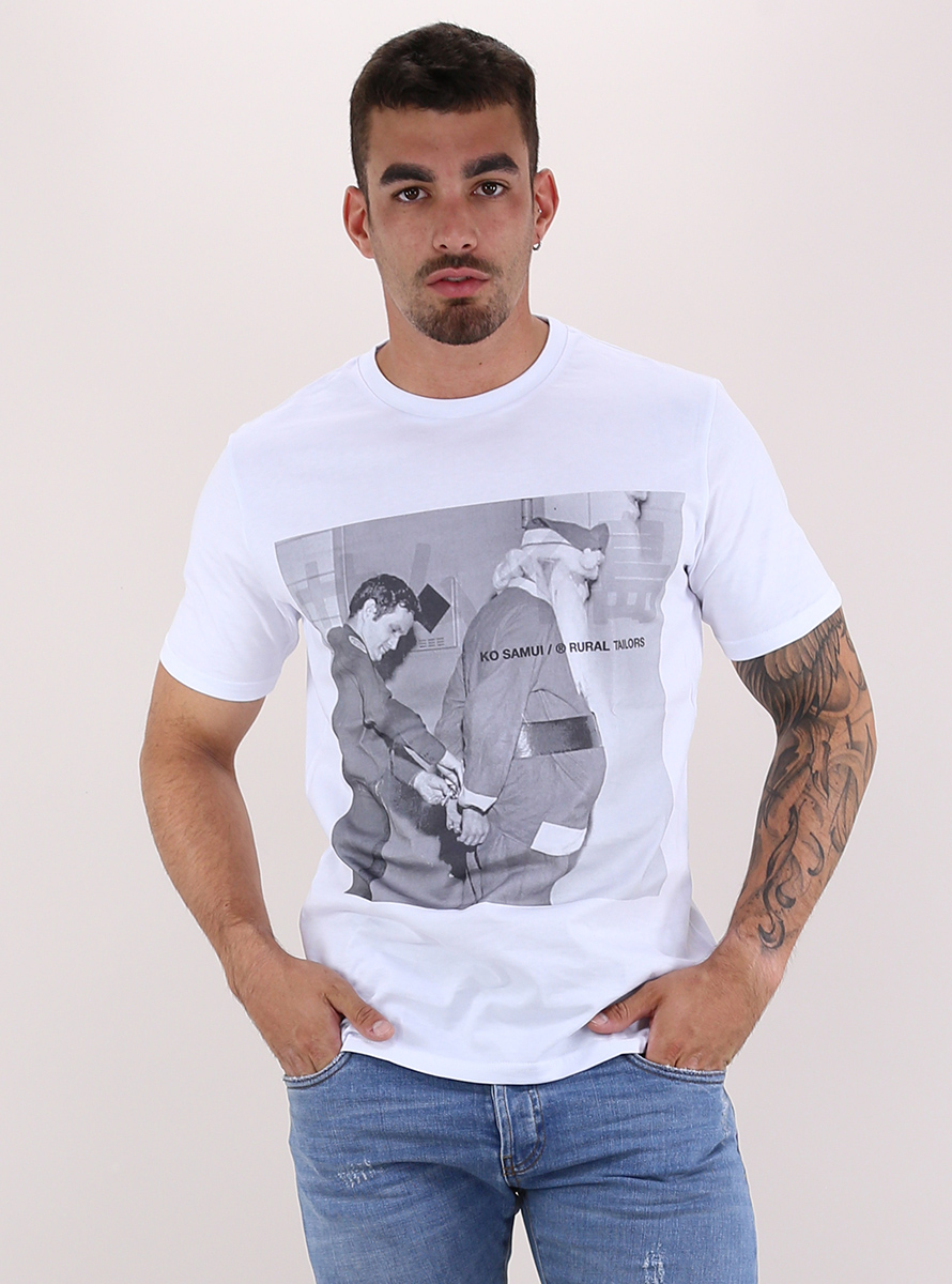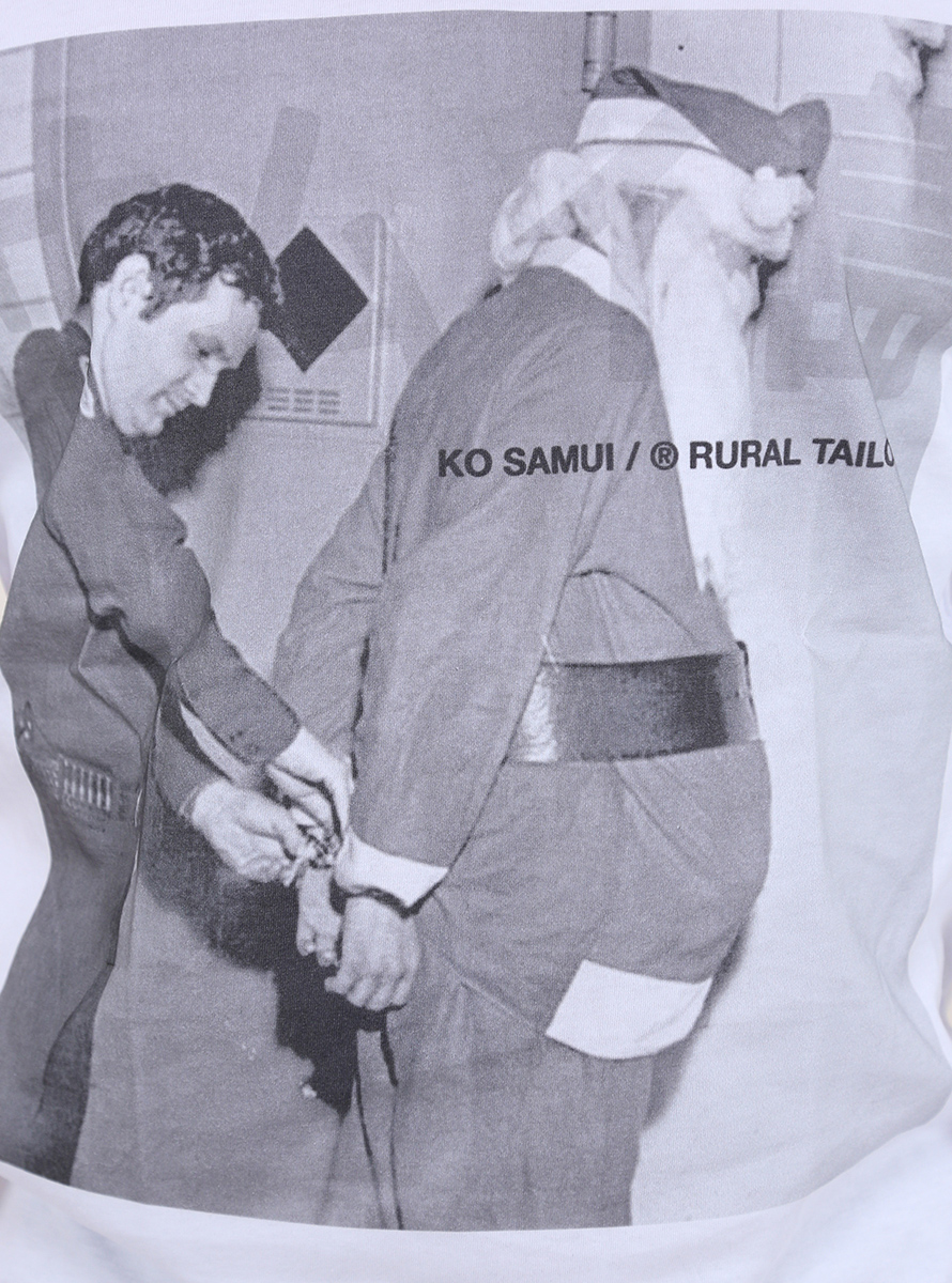 T-shirt KO Samui in cotone a maniche corte e collo a giro. Stampa frontale Babbo Natale. Il modello è alto 1.75 e indossa la taglia L.