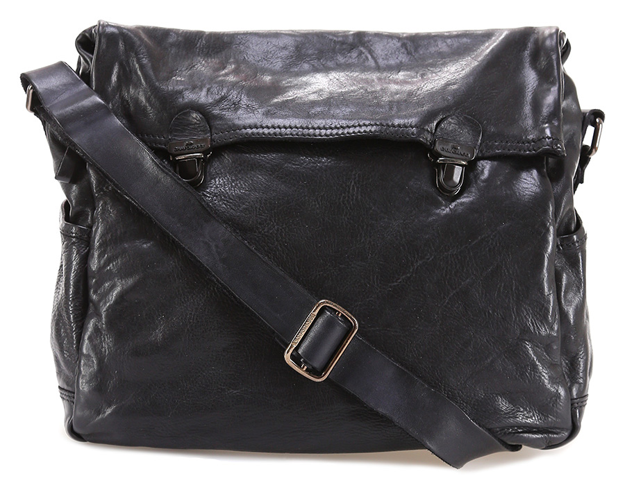 Borsa in pelle effetto martellato con chiusure a scatto. Tracolla inclusa, tasche laterali e sul retro. Misure 34 x 36 cm. Dettagli silver.