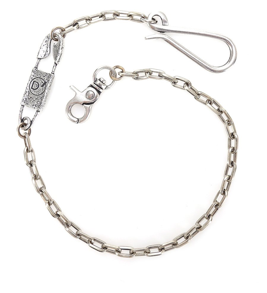Catena in ottone con spilla da balia logata. Moschettone di chiusura. Dettagli silver.