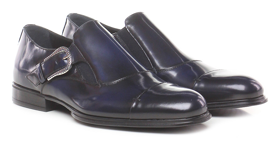 Senza stringhe in pelle spazzolata con inserti elasticizzati ambo lati e cinturino con fibbia lato esterno, suola in gomma. Tacco 25.