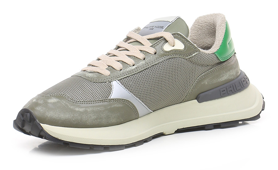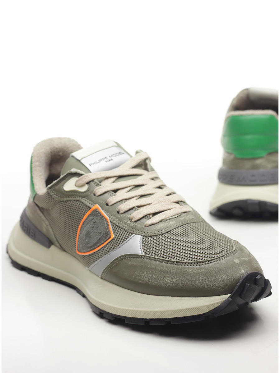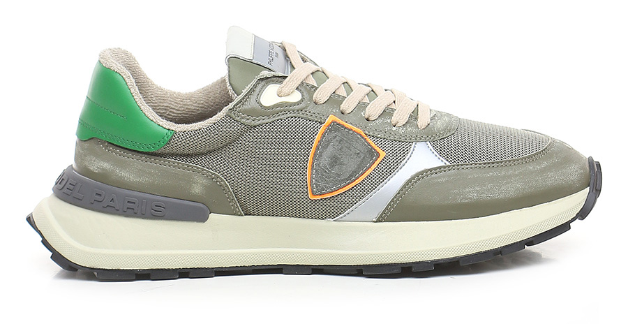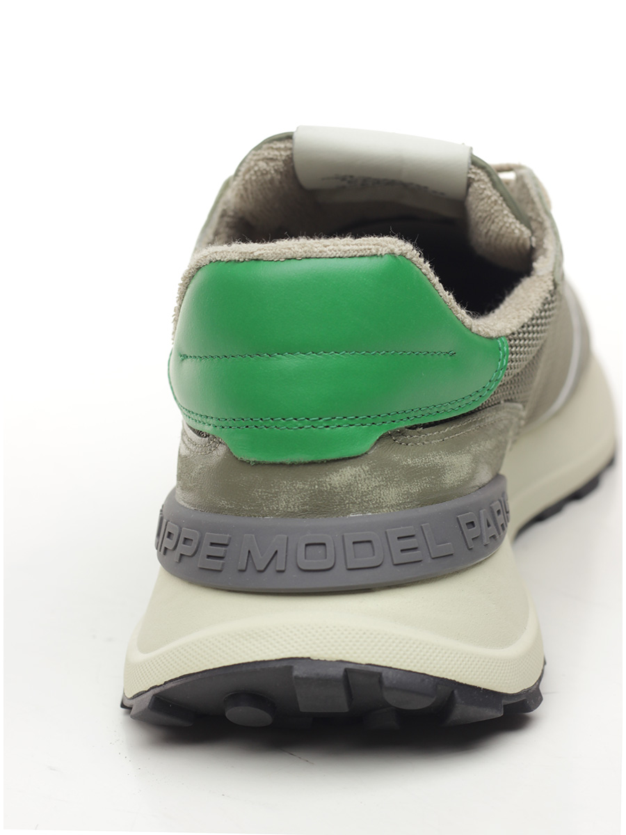 Sneaker in tessuto e pelle effetto vintage con inserti in pelle e pelle laminata. Suola in gomma. Altezza tacco 35mm, platform 25mm con battuta 10mm.