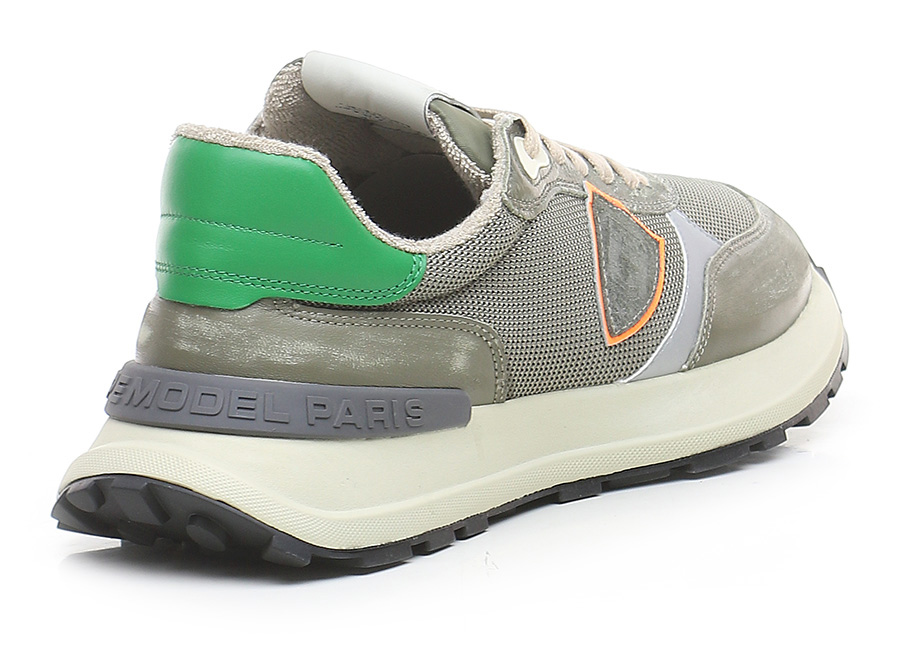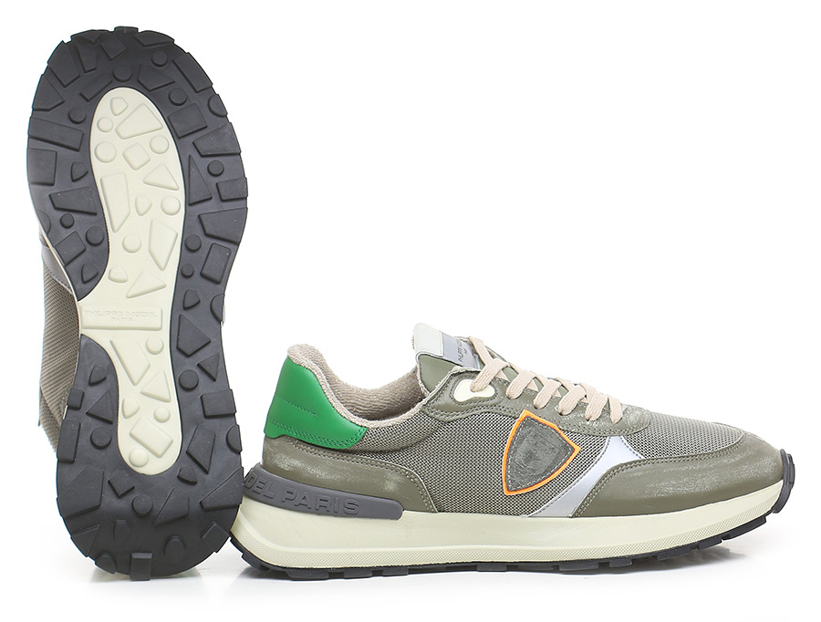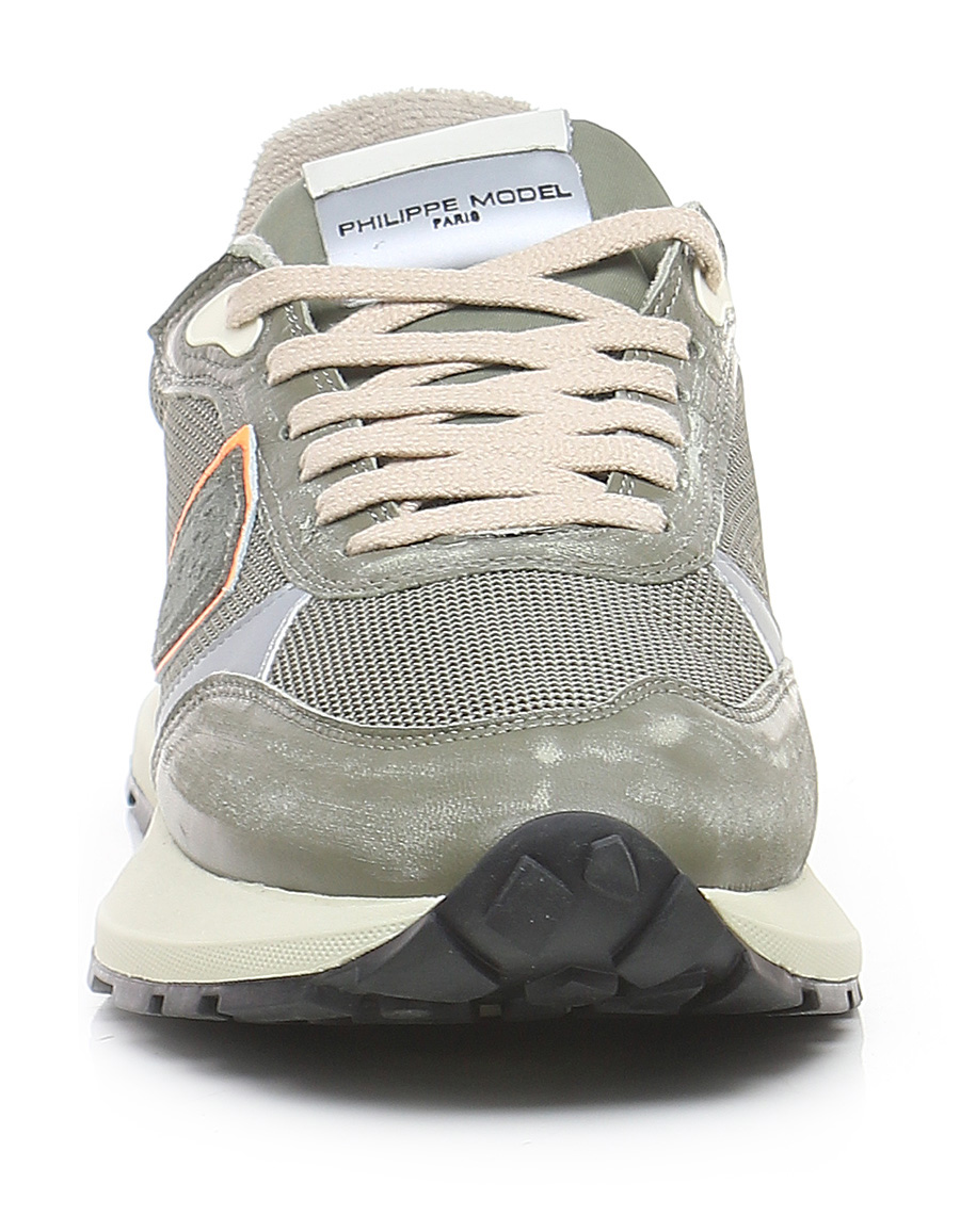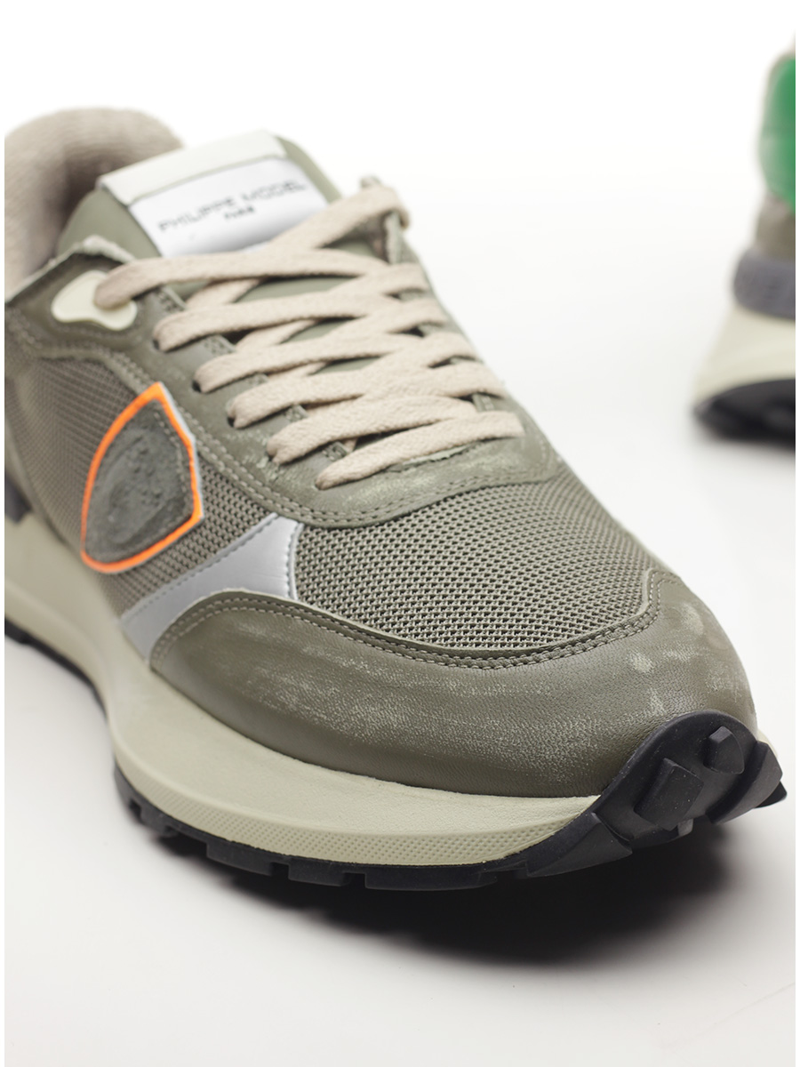 Sneaker in tessuto e pelle effetto vintage con inserti in pelle e pelle laminata. Suola in gomma. Altezza tacco 35mm, platform 25mm con battuta 10mm.
