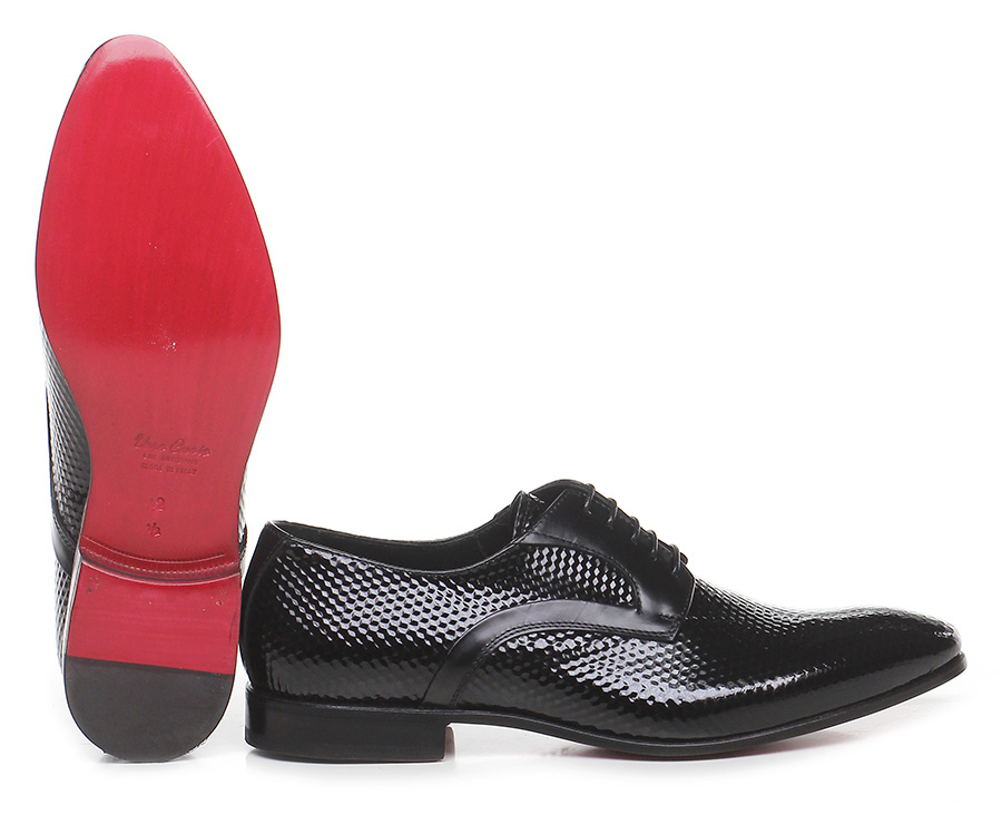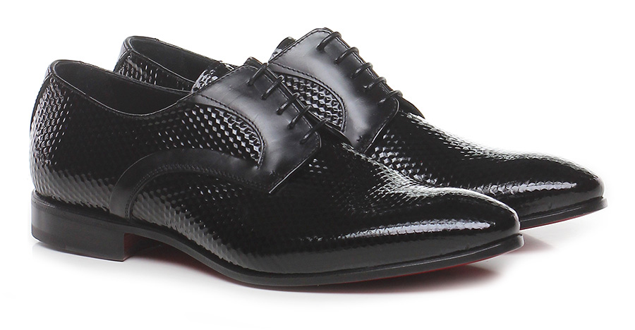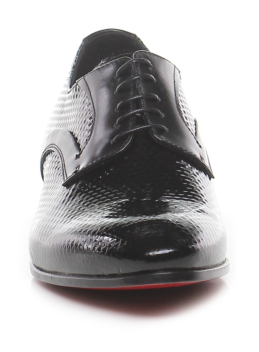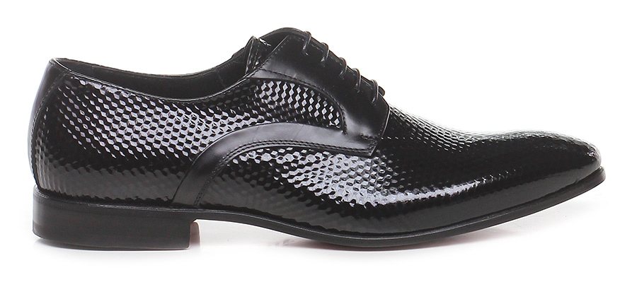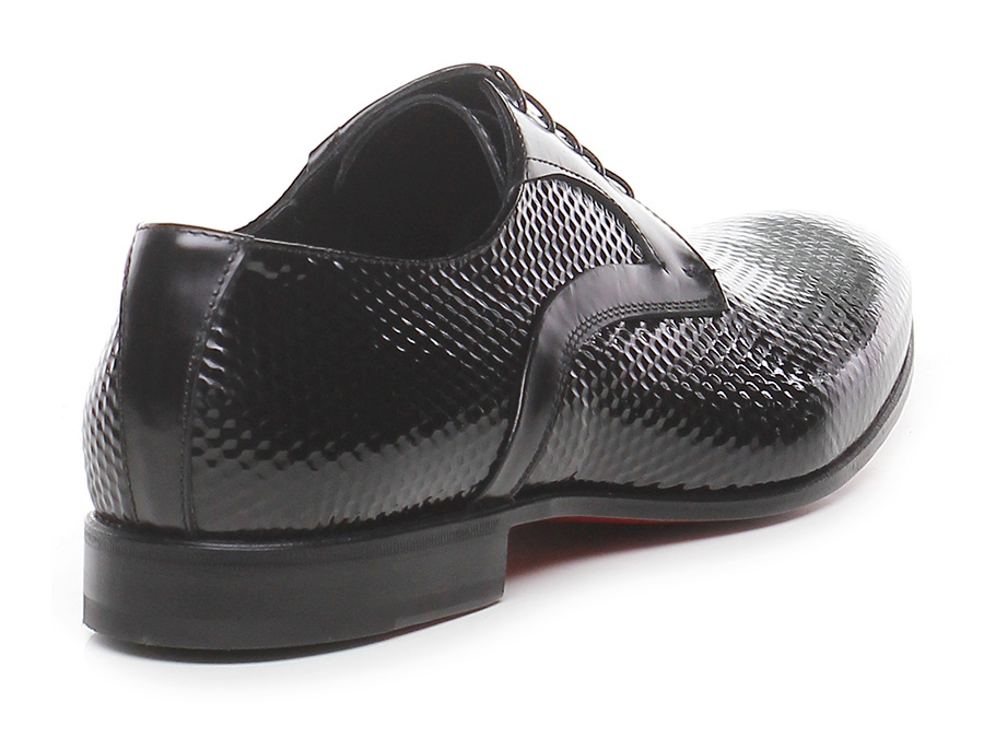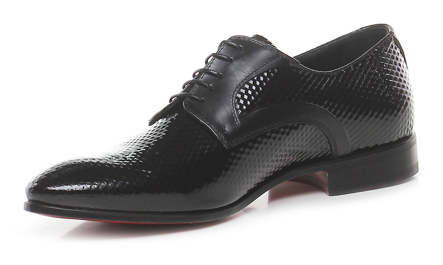 Stringata in pelle lavorata lucida, suola in cuoio e gomma. Tacco 25.