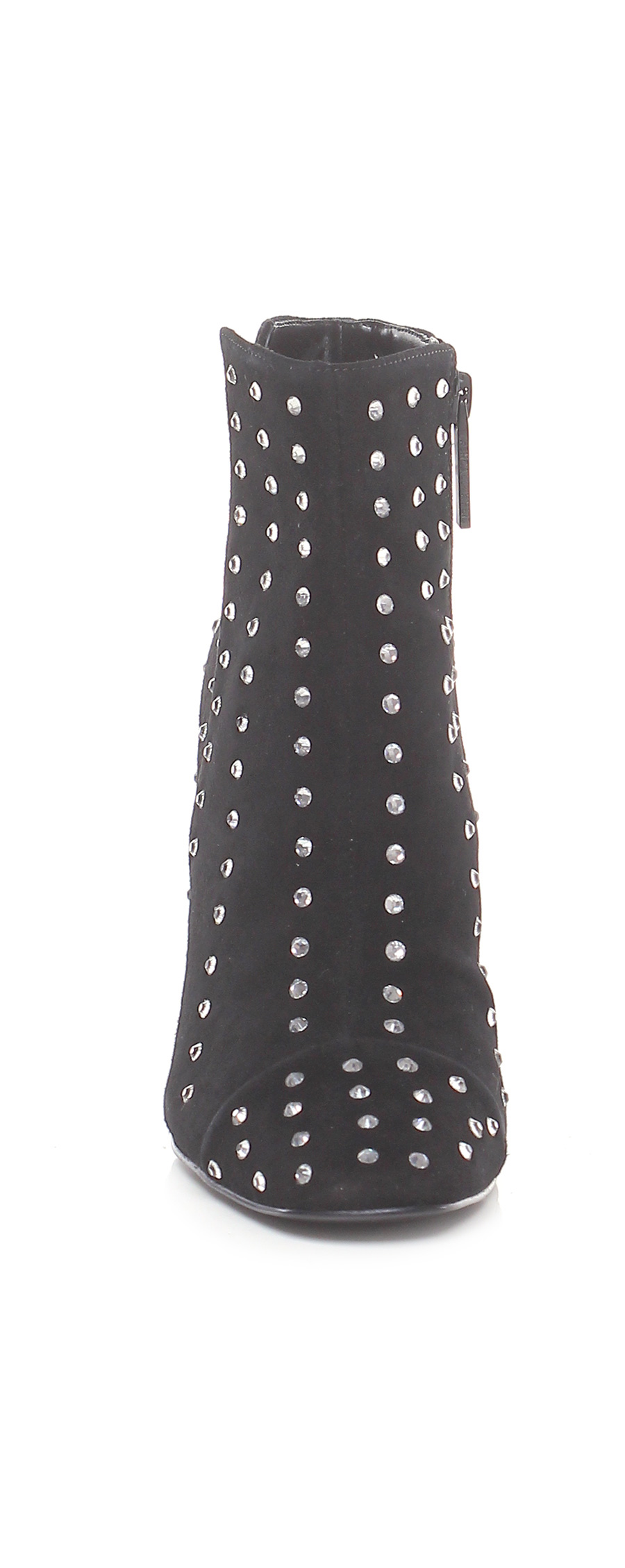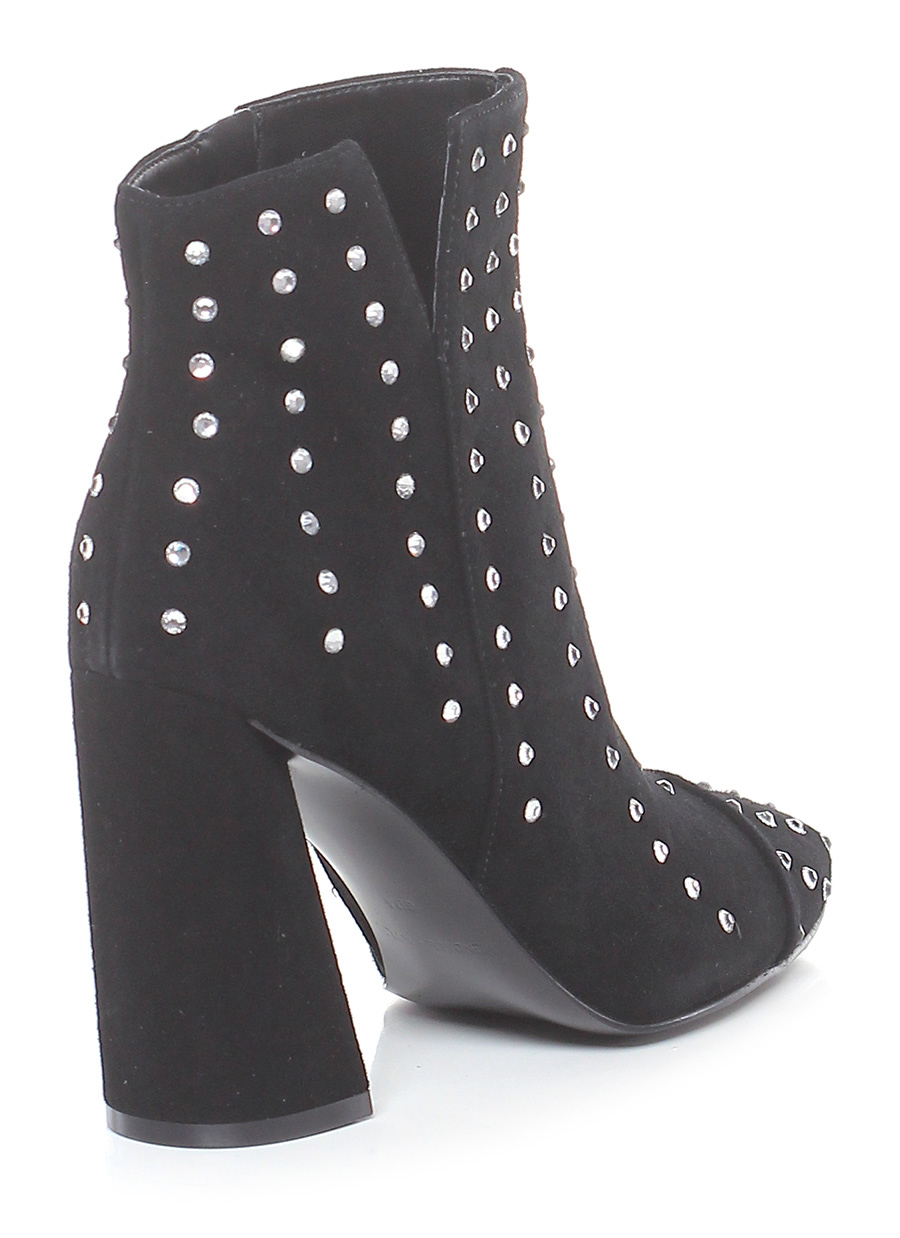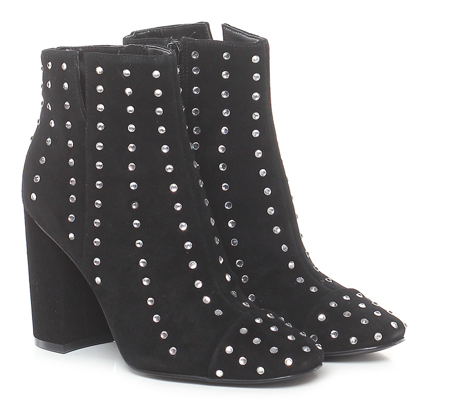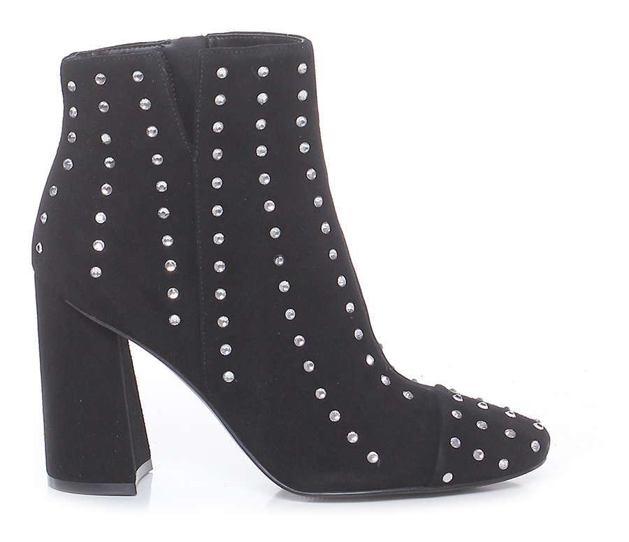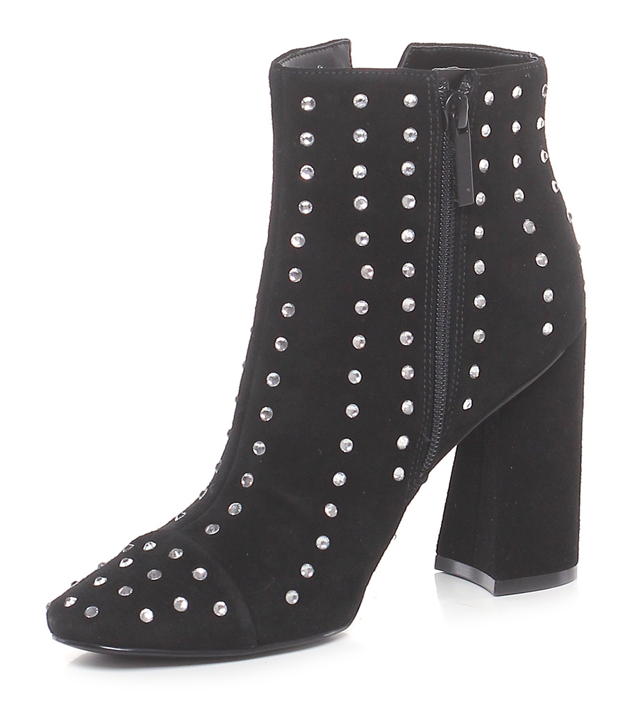 Tronchetto in camoscio con zip su lato interno e strass su tomaia. Suola in gomma, tacco 100.
