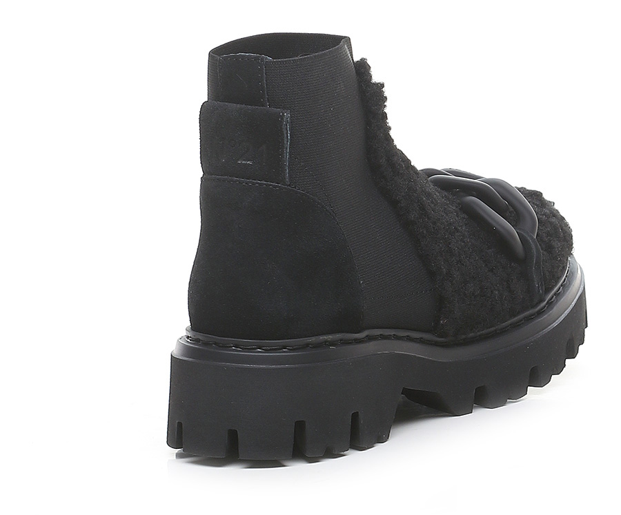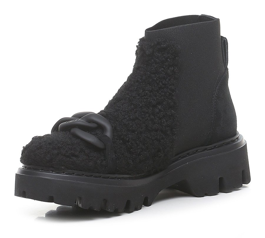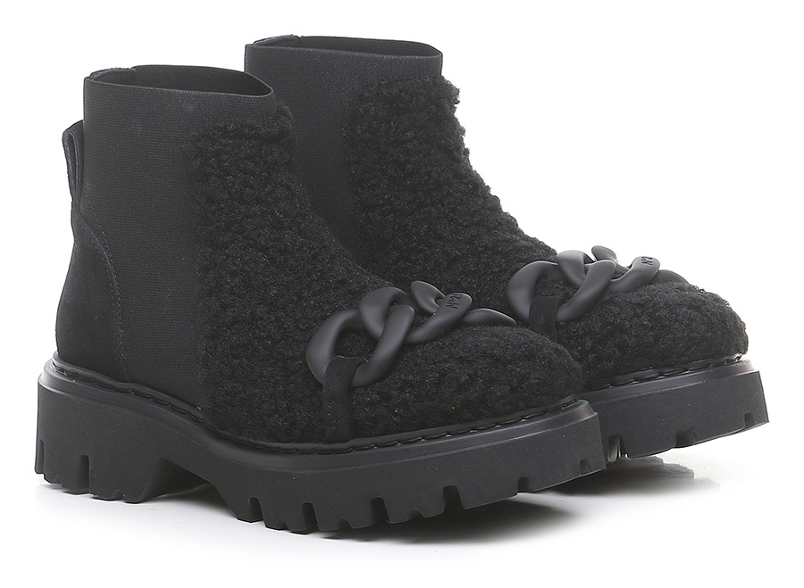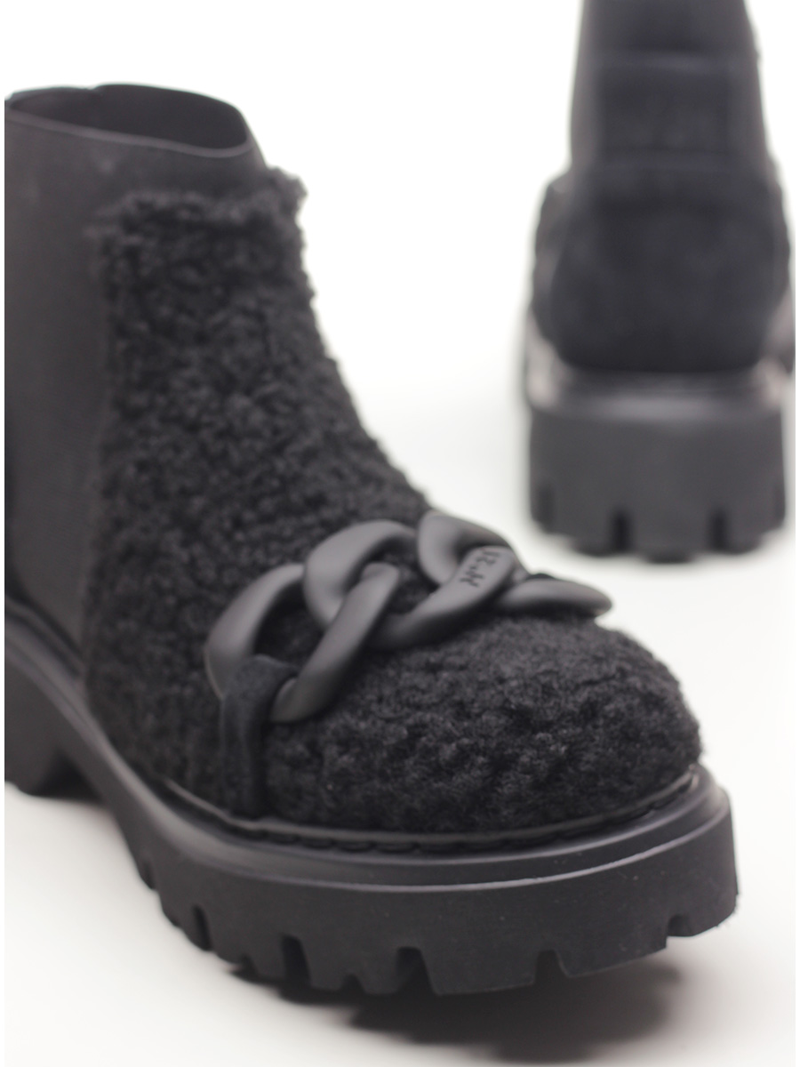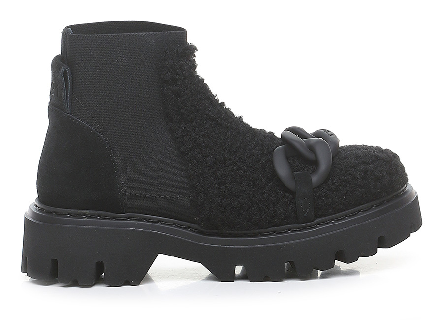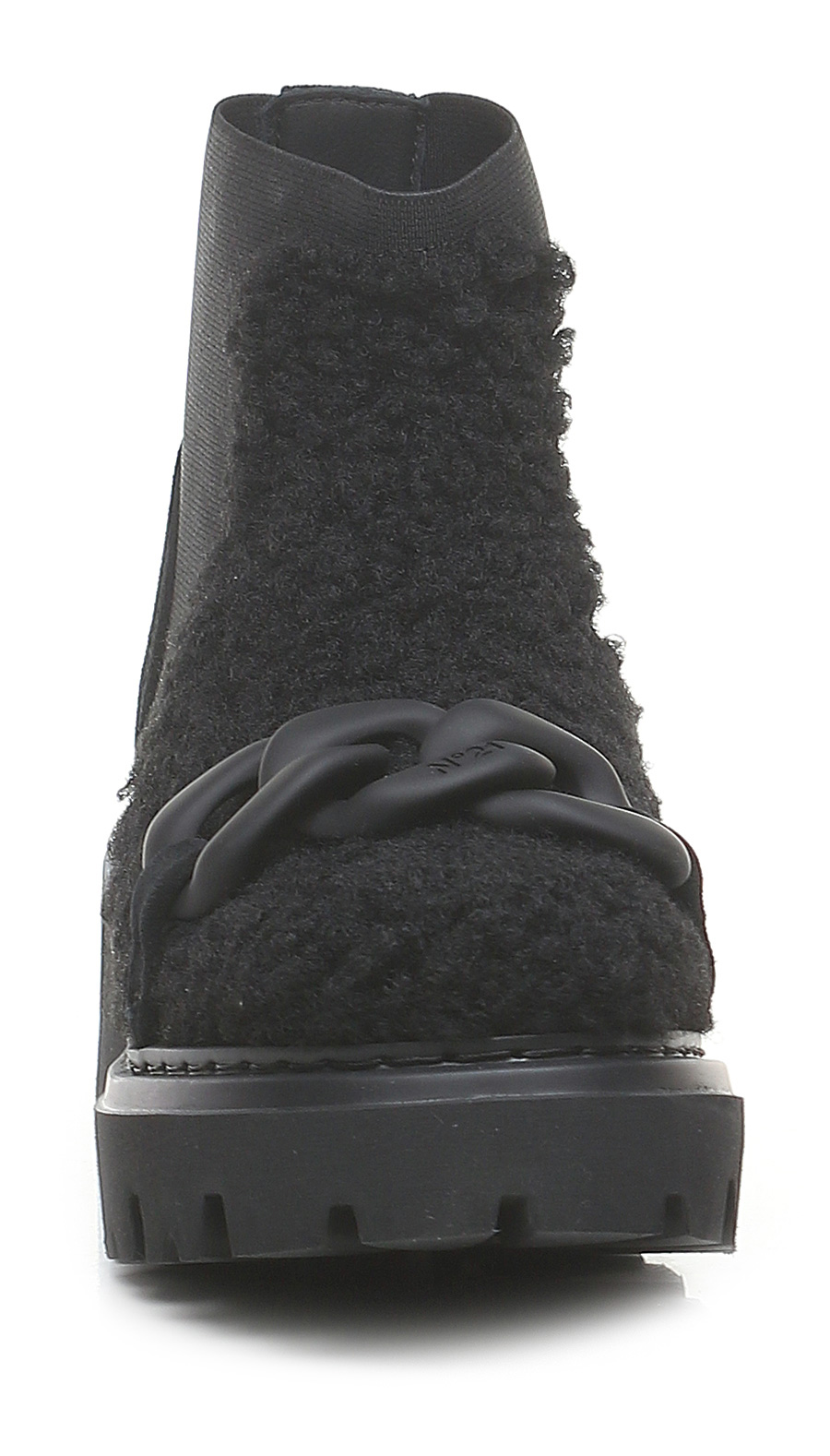 Tronchetto in tessuto e camoscio con inserti elasticizzati e acessorio frontale a catena. Suola in gomma. Altezza tacco 55mm, platform 35mm con battuta 20mm.