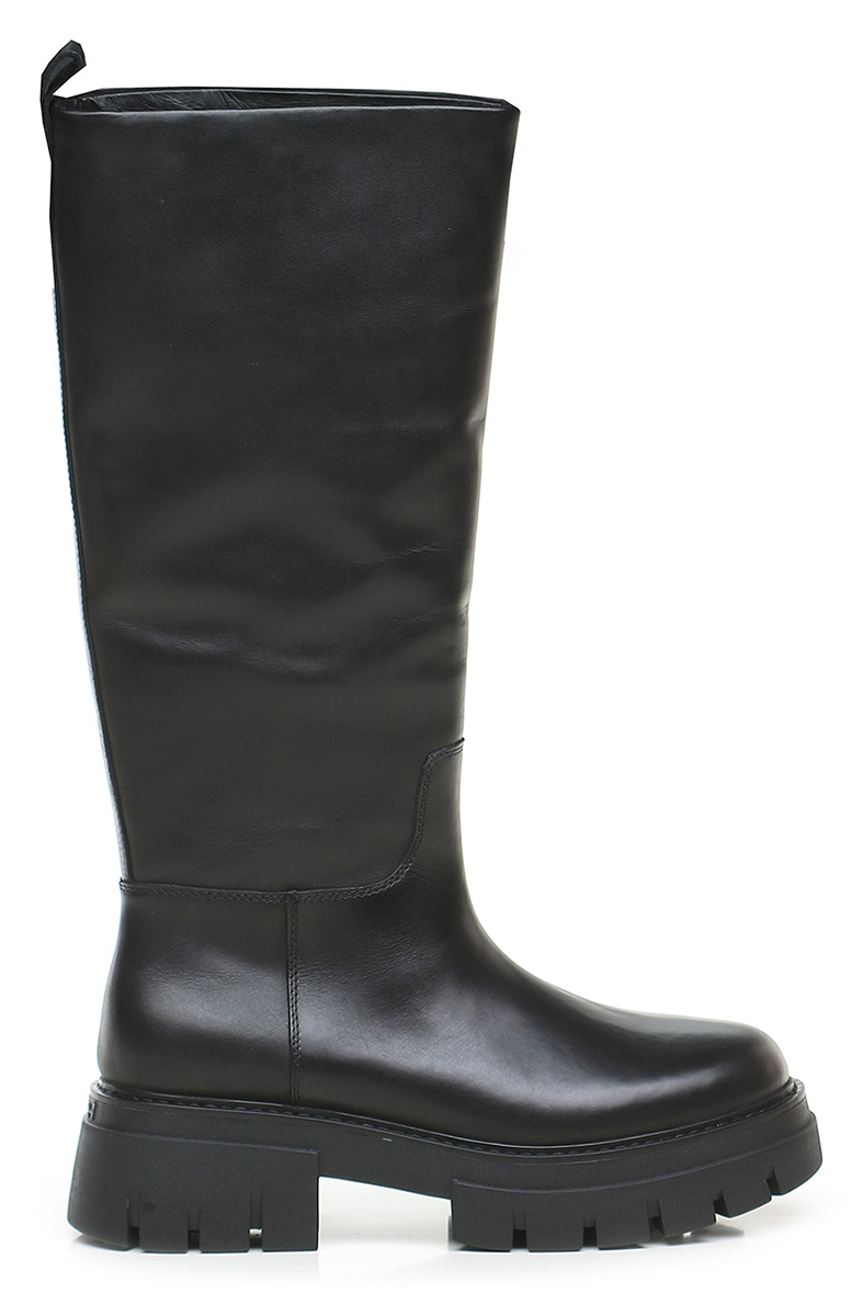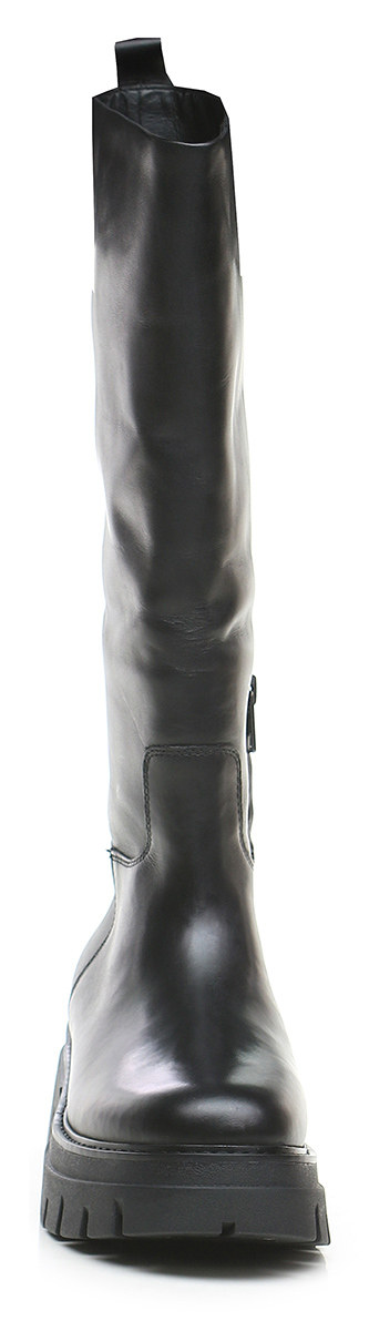 Stivale in pelle con zip laterale. Suola in gomma carrarmato. Altezza tacco 55mm, platform 35mm con battuta 20mm. Altezza gambale 36,5cm.