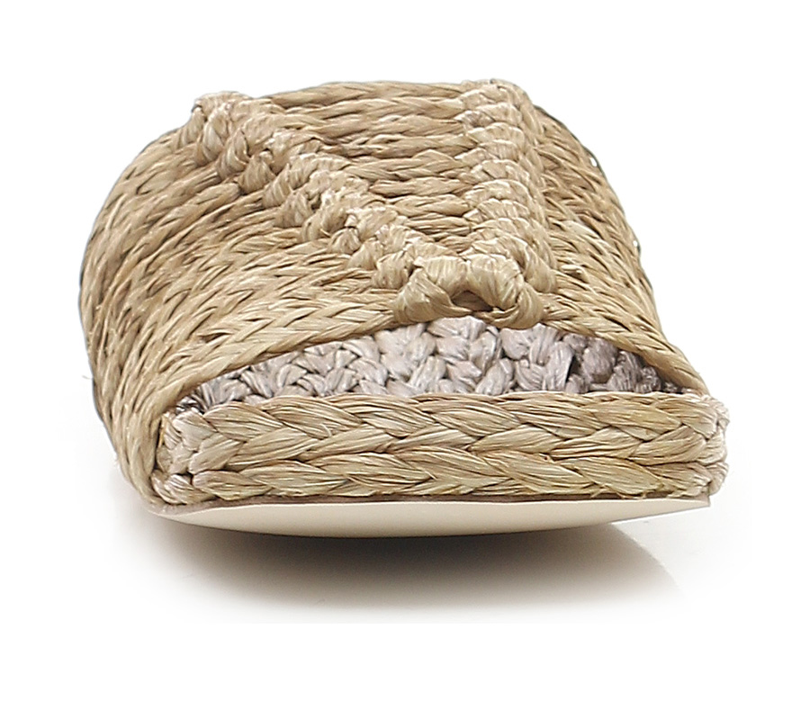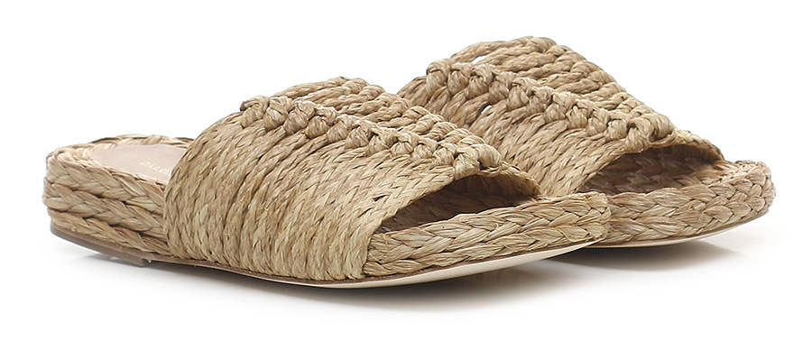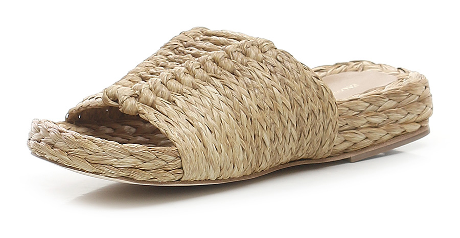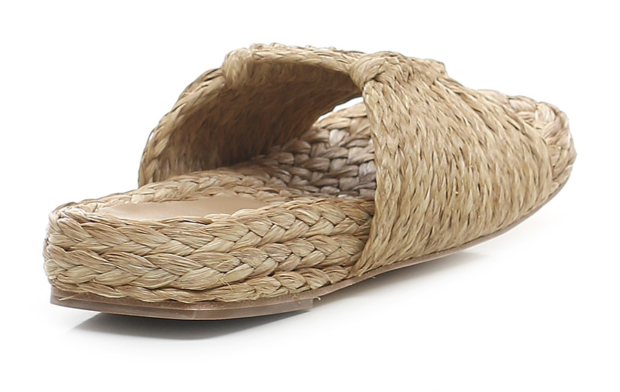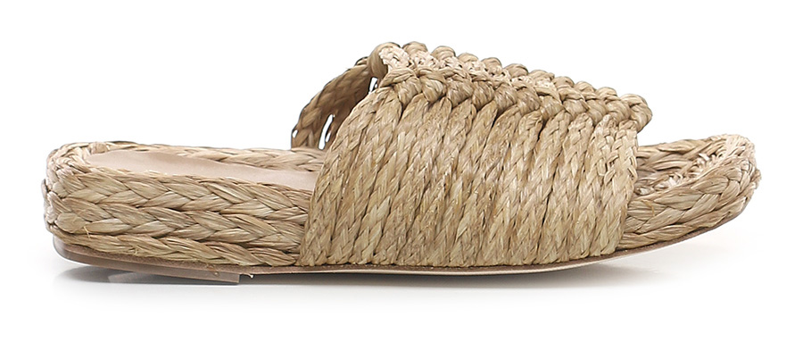 Sandalo in raffia lavorata intreccio. Suola in cuoio. Altezza tacco 30mm, platfom 20mm con battuta 10mm.